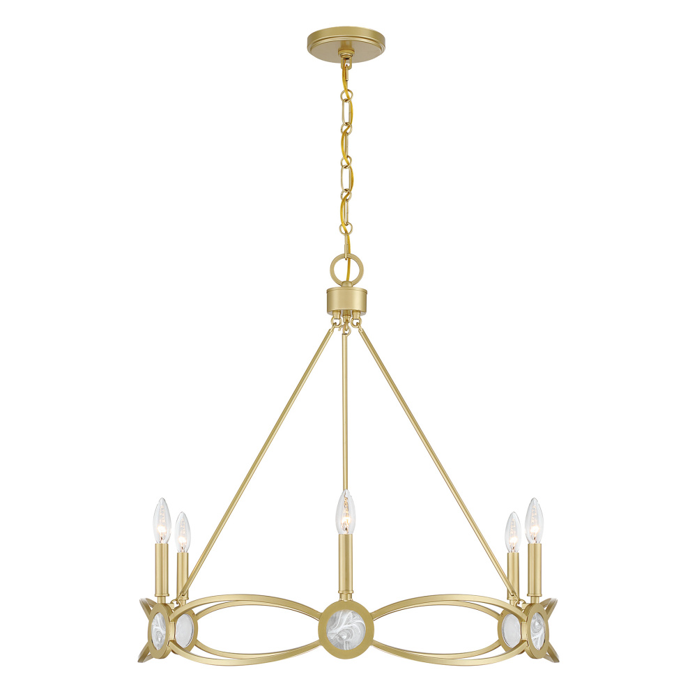 The Savoy House Minette 6-light chandelier dazzles with its refined take on artistic glass. Radiant strie glass disks radiate outward in a petal-inspired arrangement, complemented by the warm, glowing touch of the Spun Gold finish. Minette is 27.25" high and 28" wide. It uses six candelabra size bulbs of up to 60 watts per bulb. Bulbs not included. Comes with 120" of chain.