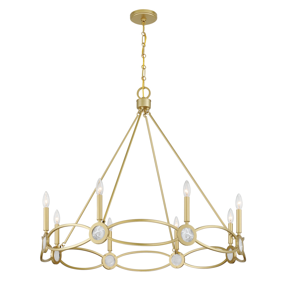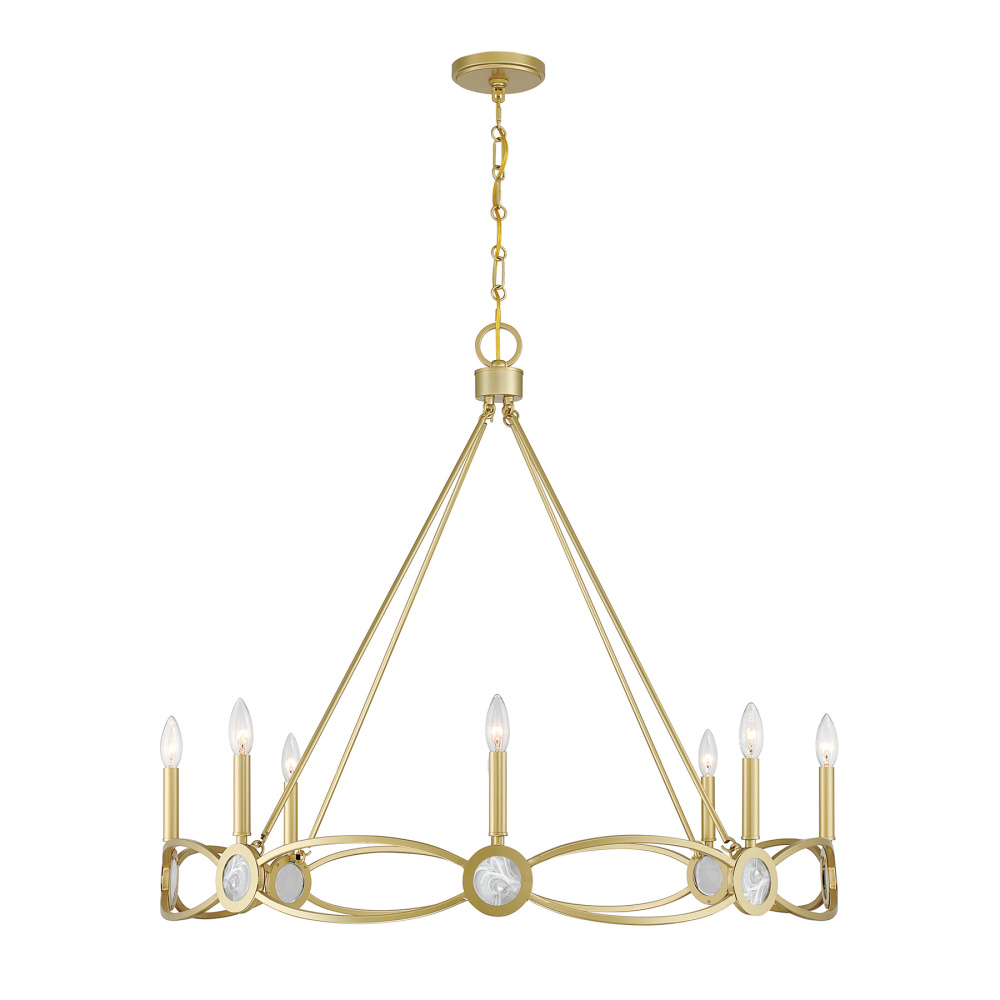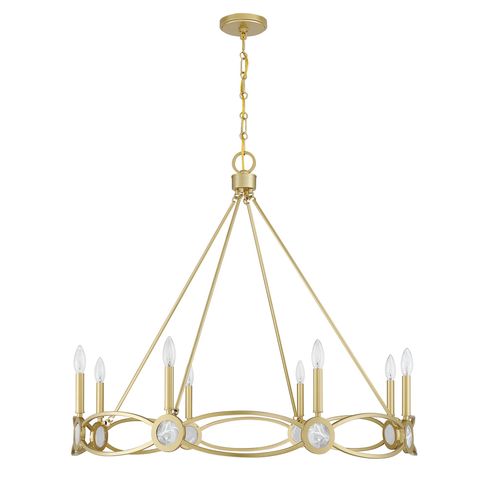 The Savoy House Minette 8-light chandelier offers a showstopping interpretation of strie glass. Its graceful petal-like disks form a radiant composition and are complemented by the understated warmth of the Spun Gold finish. Minette is 34" high and 37" wide. It uses eight candelabra size bulbs of up to 60 watts per bulb. Bulbs not included. Comes with 120" of chain.