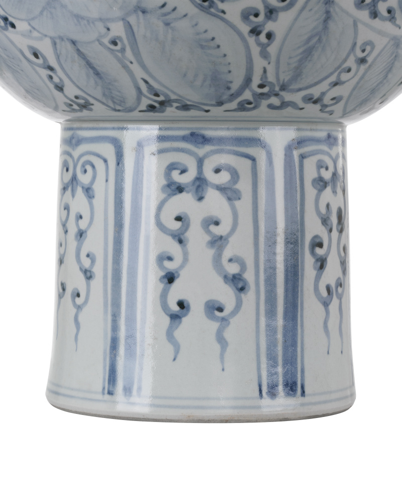 The Ming Offering Pedestal Bowl is made of hand-painted porcelain in a classic blue and white pattern. The elegant piece features intricate floral and geometric motifs that honor the refined artistry of the Ming dynasty. The bowl rests on a graceful pedestal that elevates it to make it a perfect centerpiece. Whether it is filled with fruits or decorative accents or simply left empty to be admired as a work of art, it will radiate beauty. Because it is hand-painted, patterns will vary slightly on each piece.
