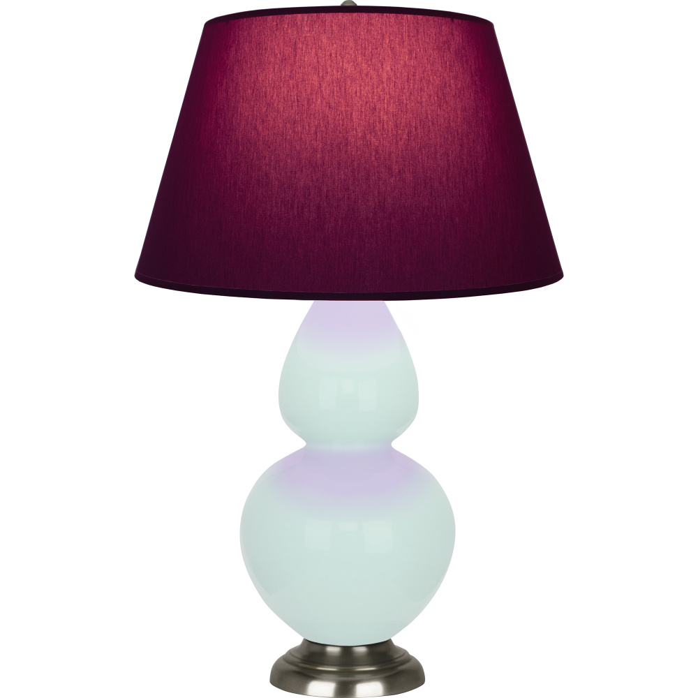Mint Glazed Ceramic with Antique Silver Finished Accents Double Gourd Table Lamp with Plum Fabric Shade with Lavender Lining - Our Double Gourd collection features a simple but gracefully curving silhouette. Available in a wide array of vibrant colors and several different base finishes.