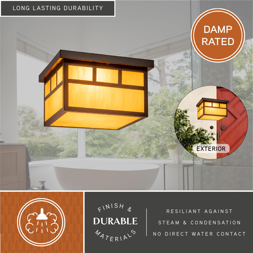 Flat strips of burnished bronze outline honey opal glass panes in the Mission collection. The simple design of this fixture has a mission style look perfect for Frank Lloyd Wright prairie inspired decors. This outdoor ceiling light is ideal for your porch, entryway, or any other area of your home.