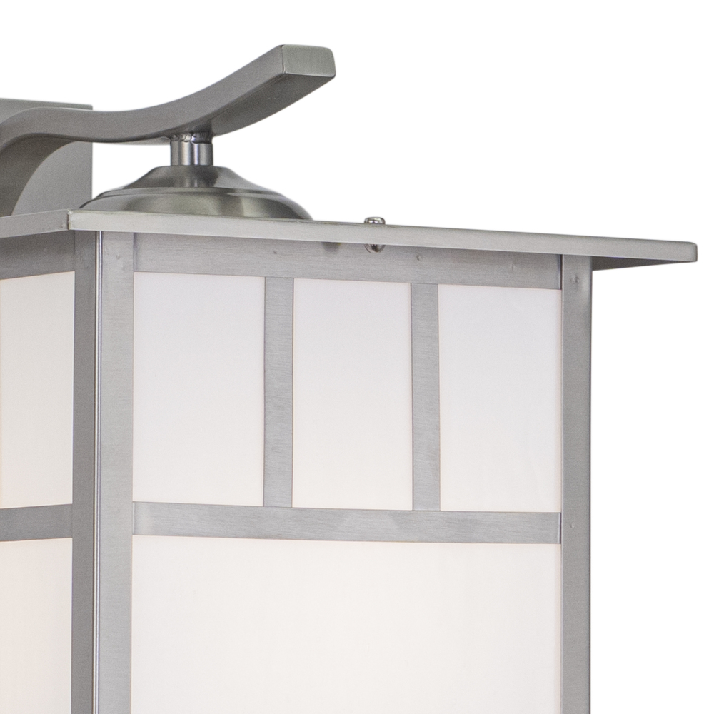Flat strips of stainless steel outline white tiffany style glass panes in the Mission collection. The simple design of this fixture has a mission style look perfect for Frank Lloyd Wright prairie inspired decors. This outdoor wall light is ideal for your porch, entryway, garage, or any other area of your home.