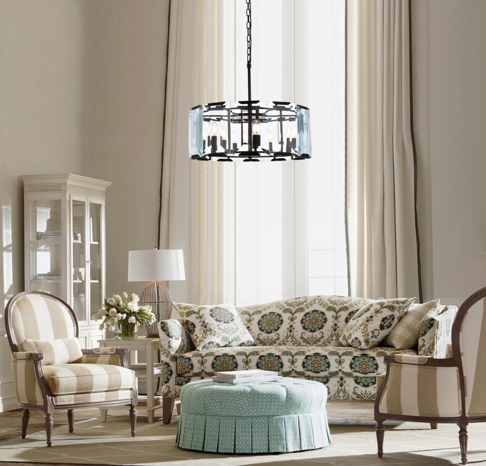 An eternity of reflection with exotic flair, Monaco chandeliers will bring illumination to your kitchen, office, or dining room, Brilliant emerald-cut glass panes capture and magnify the soft gleam of exposed bulbs. Rectangular or circular steel frames available in flat-black or golden-iron finishes give these lamps distinguished appeal.