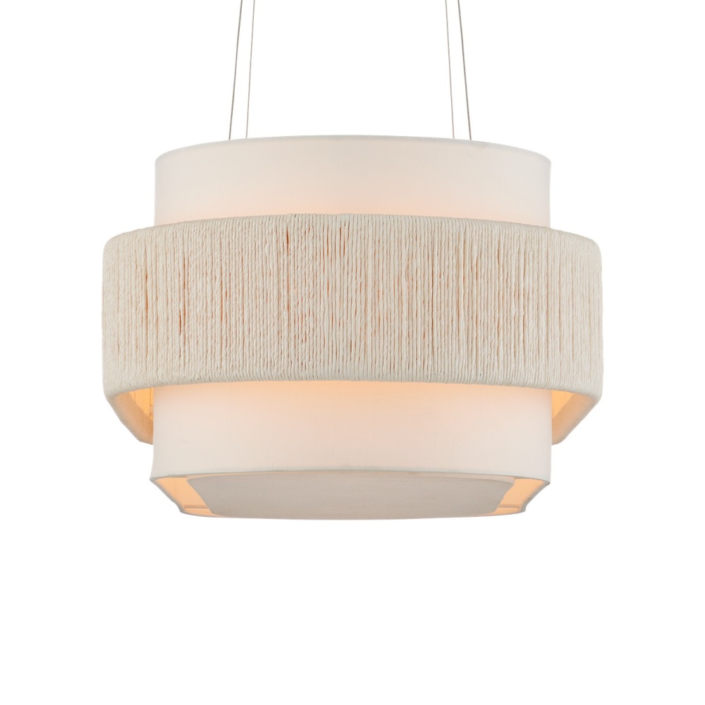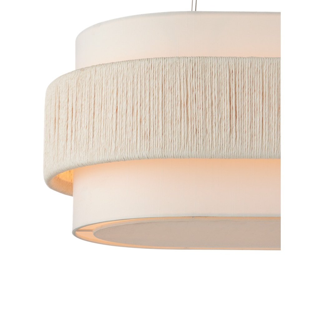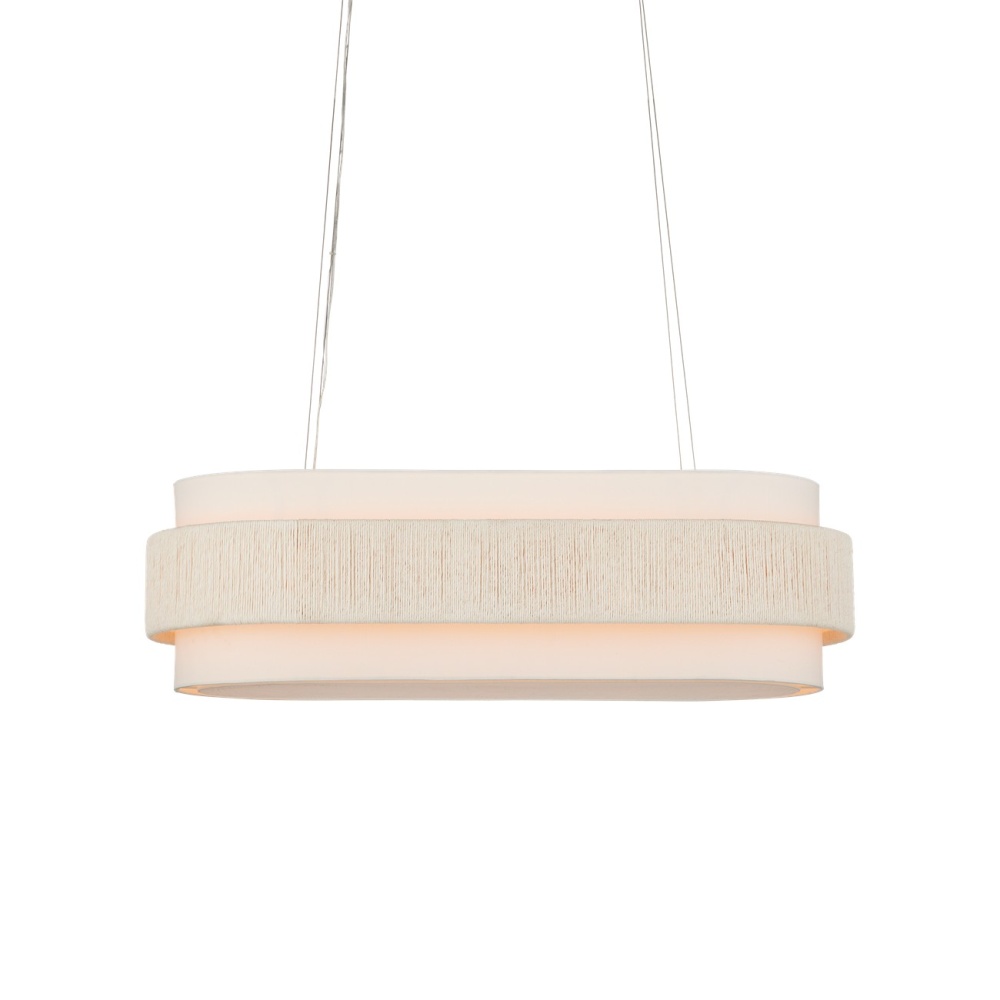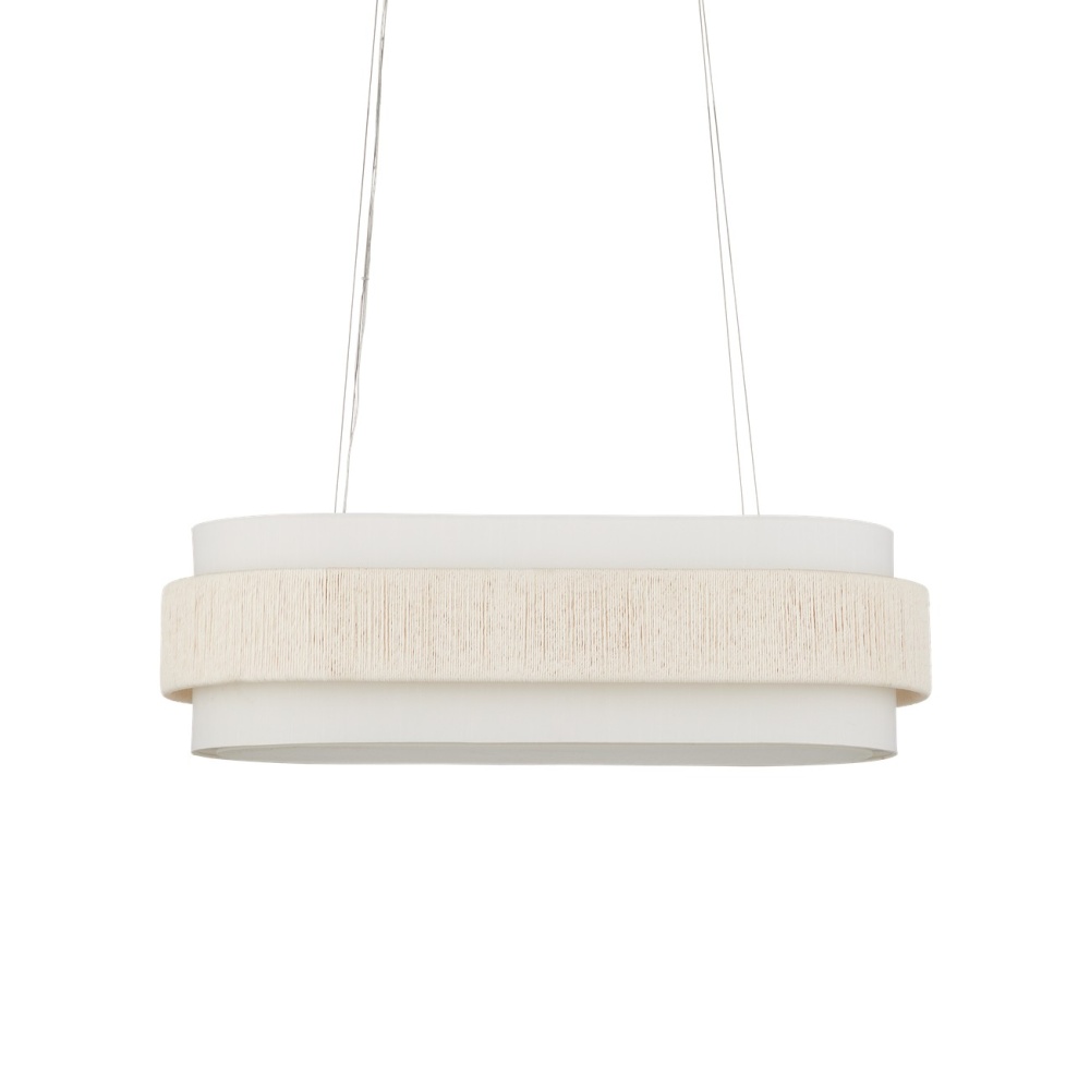 With a band made from recycled paper that has been twisted like braided hair, the Monreale Oval Chandelier has an ultra-contemporary cleanness to its design. The paper, which is painted white, is wrapped around the middle of an off-white shantung shade. The canopy is finished in a Sugar White that contributes to the lightness of this white chandelier. The bottom of the shade is fitted with a diffuser to soften the glow. Adjustable from 19.5" to 150" with use of included chain/rod kit/cable. If your space calls for a longer drop, additional chain/rods/cable is available for purchase.