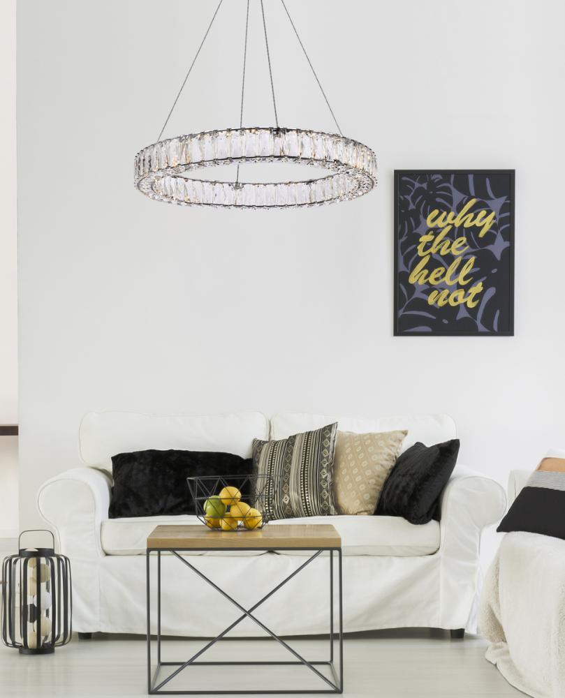 Diamonds are a girl’s best friend, and sparkling Monroe collection hanging fixtures take Marilyn’s famous lines to heart … for women and men alike. A minimal stainless-steel frame becomes dazzling when it is covered entirely with rectangular and square spectacularly faceted clear crystals. The oblong design hangs from almost invisible wires with brilliant integrated LED shining unseen from within. Stunning when placed in a dining room, kitchen, living room, or bedroom.
