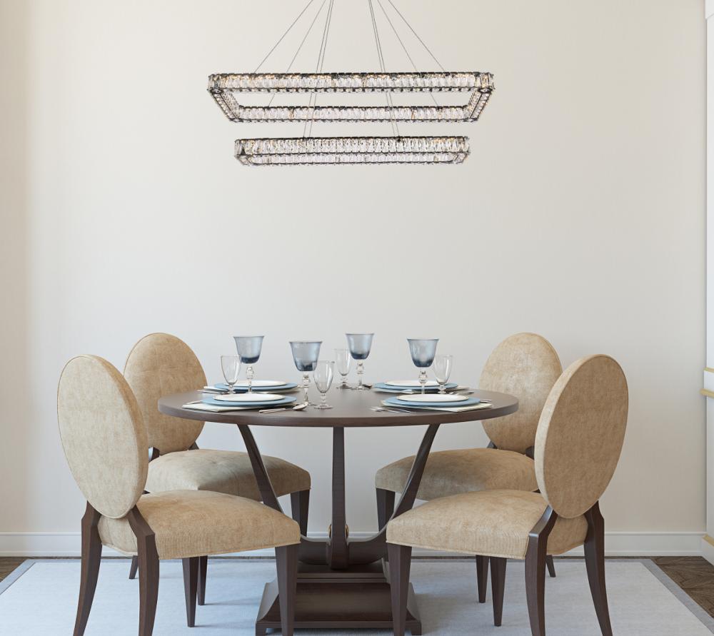 Diamonds are a girl’s best friend, and sparkling Monroe collection hanging fixtures take Marilyn’s famous lines to heart … for women and men alike. A minimal stainless-steel frame becomes dazzling when it is covered entirely with rectangular and square spectacularly faceted clear crystals. The oblong design hangs from almost invisible wires with brilliant integrated LED shining unseen from within. Stunning when placed in a dining room, kitchen, living room, or bedroom.