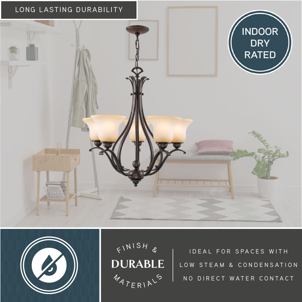 The soft traditional lines of the Monrovia collection allow you to combine styles within your home without compromising on design. The royal bronze finish and brushed cognac glass add a certain level of sophistication and elegance that is rare to achieve. Update your look with a hint of class. This fixture is part of a full collection with coordinating pieces to decorate any room in the house. This chandelier is ideal for kitchens, dining areas, and foyers.