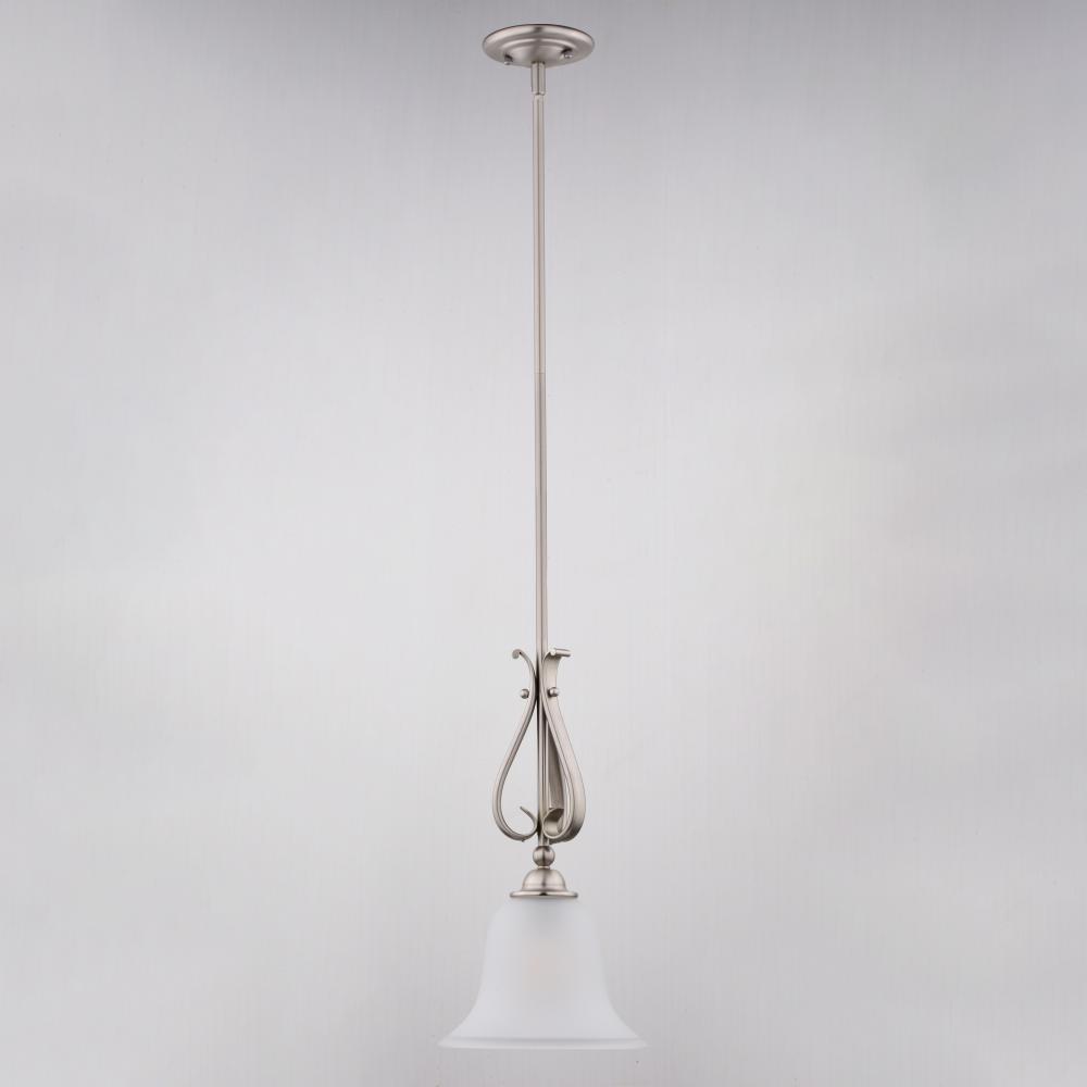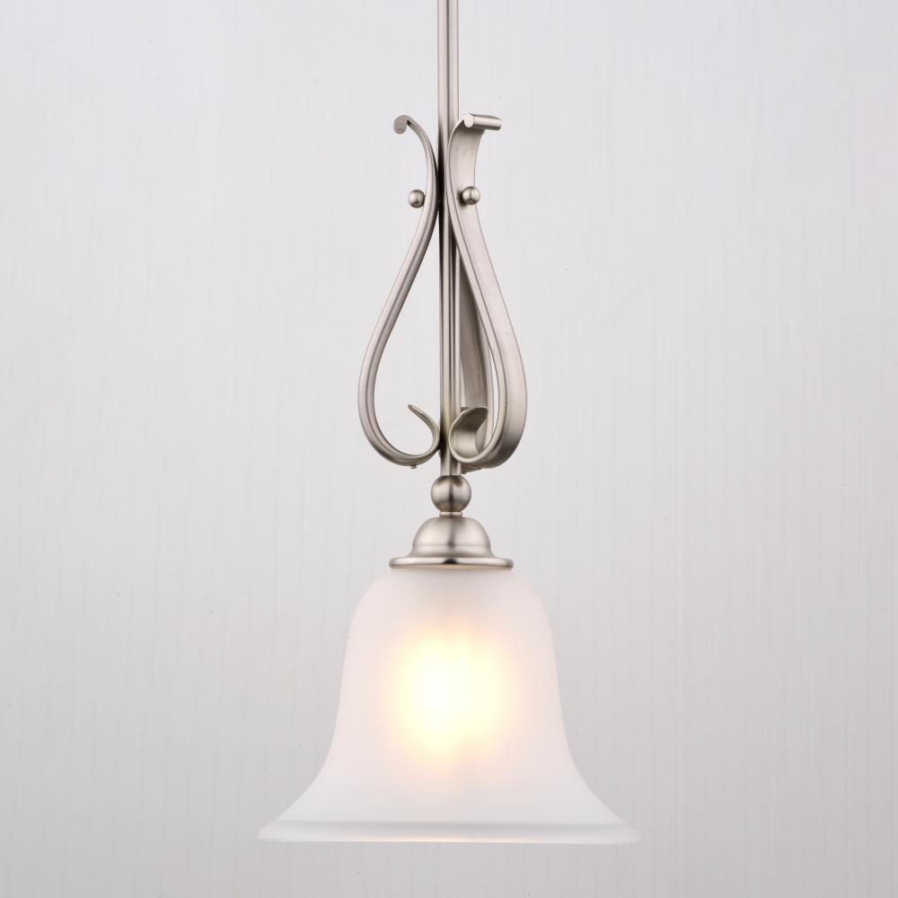 The soft traditional lines of the Monrovia collection allow you to combine styles within your home without compromising on design. The brushed nickel finish and frosted white glass add a certain level of sophistication and elegance that is rare to achieve. Update your look with a hint of class. This fixture is part of a collection with coordinating pieces to decorate any room in the house. Install this mini pendant individually or in a group; ideal for kitchens, dining areas, or bar areas.