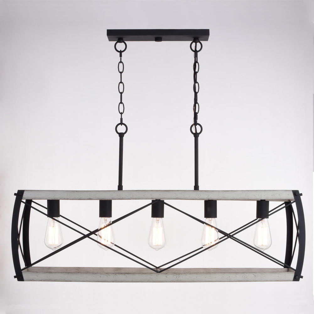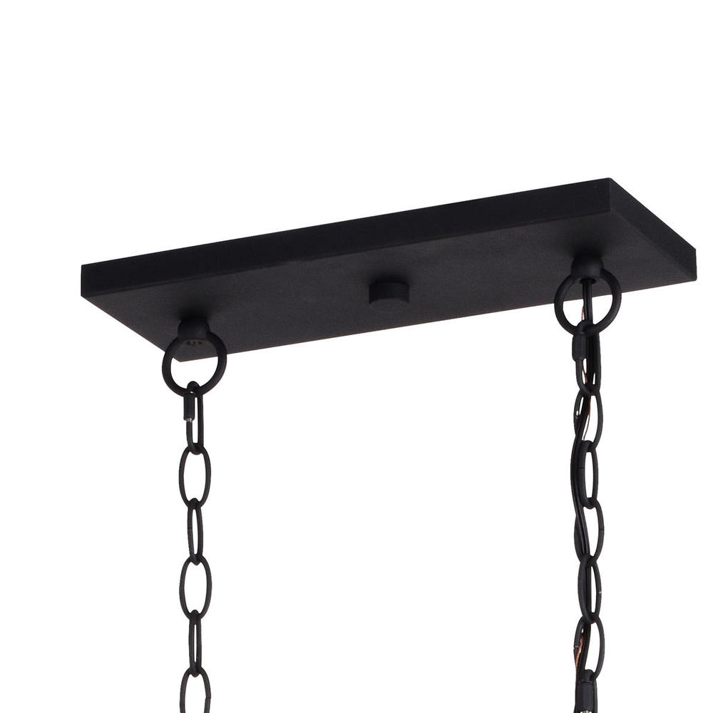 The open and airy feel of the Montclare collection is a real show-stopper! The geometric forms are solidly framed then accented with delicately spun metal wire adding a touch of visual movement. The unique color combination of textured black and natural white ash creates the perfect farmhouse appeal. This linear chandelier is ideal for any dining room, kitchen, island or other living space.