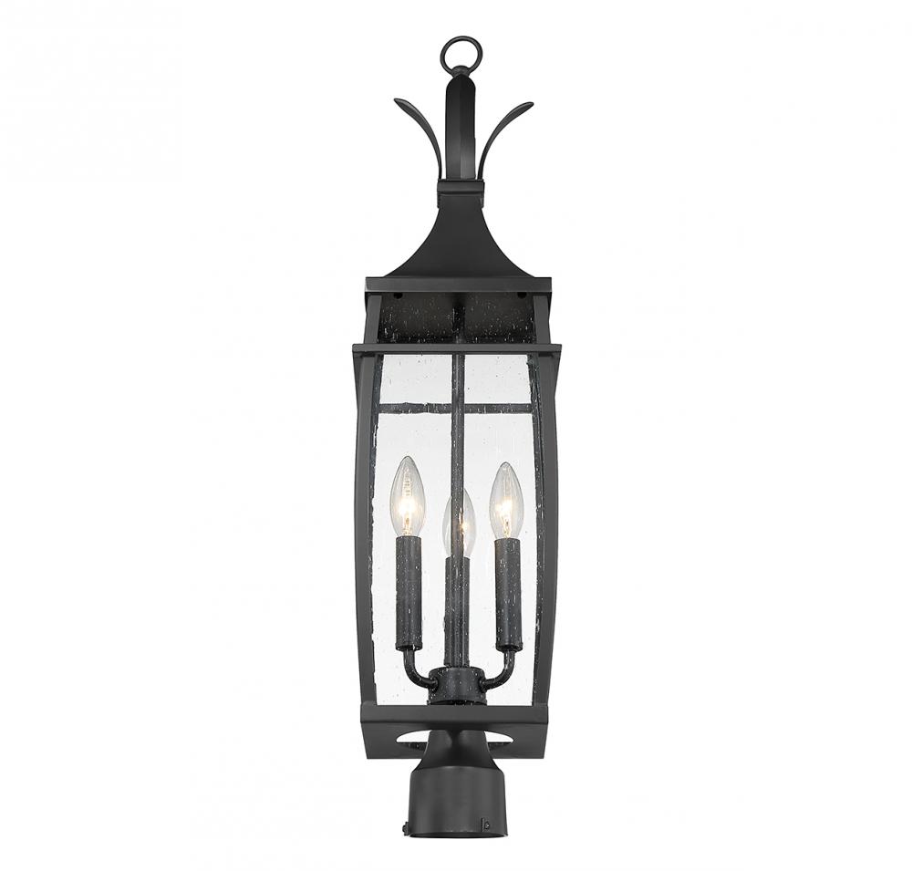 A hint of nature-inspired detailing decorates the top of this Savoy House Montpelier 3-light outdoor post light. Its slightly curved structure features panes of clear seeded glass and is finished in a classic matte black. Montpelier is 29" in height and 7.5" in width. It uses 3 candelabra size bulbs with a max of 60 watts per bulb (bulbs not included).