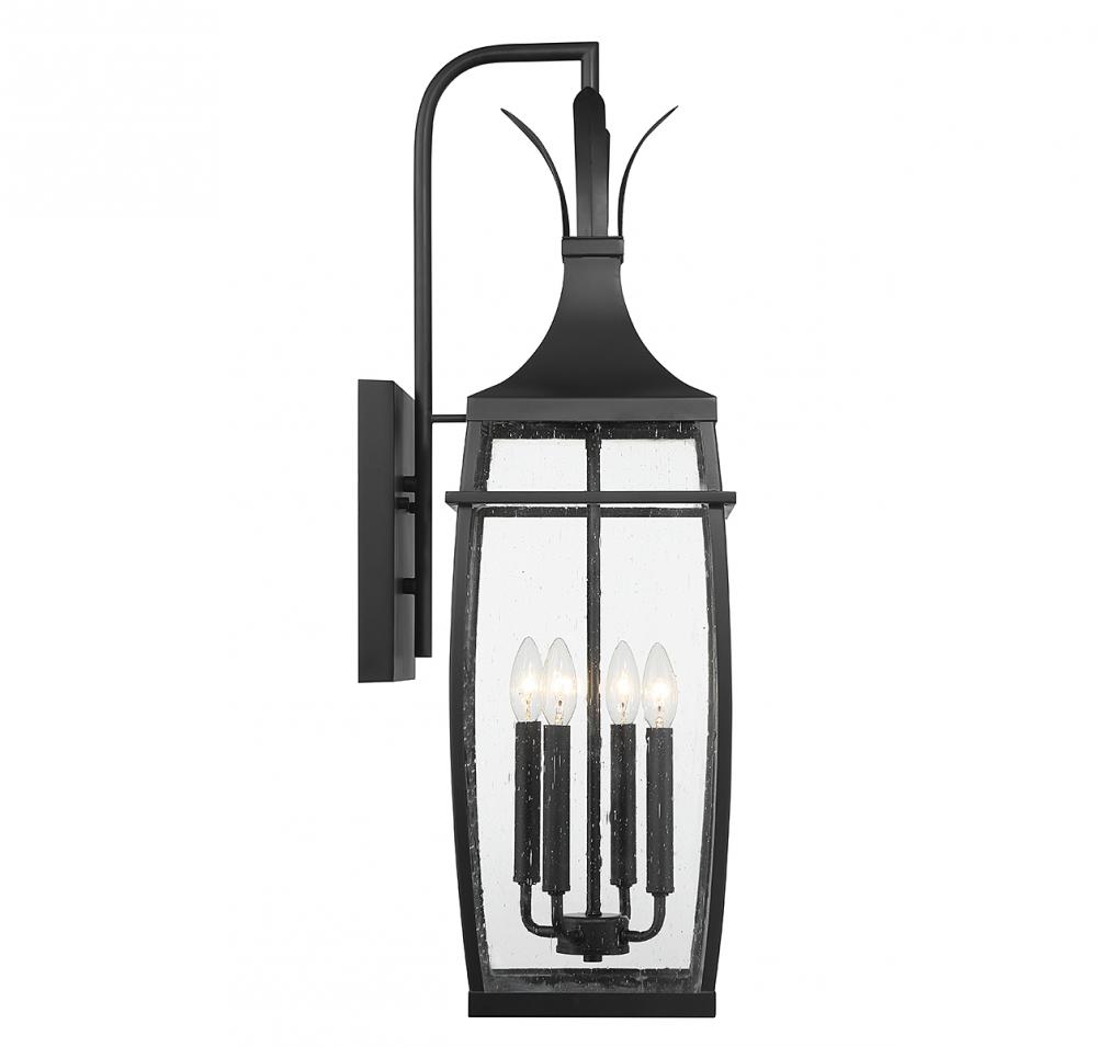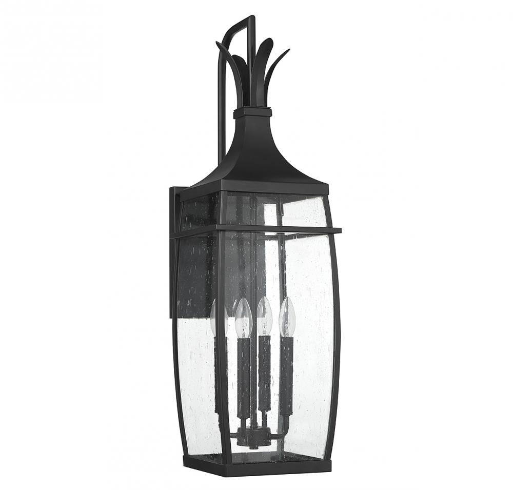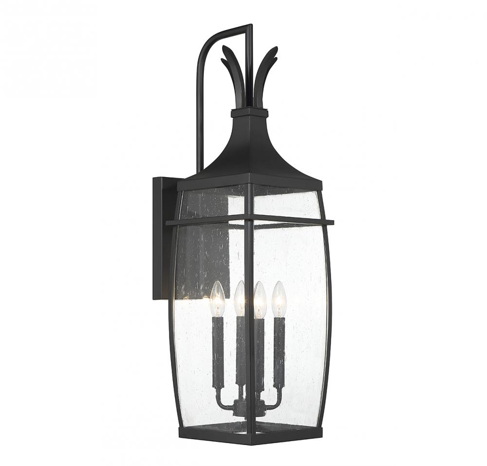 A hint of nature-inspired detailing decorates the top of this Savoy House Montpelier 4-light outdoor wall light. Its slightly curved structure features panes of clear seeded glass and is finished in a classic matte black. Montpelier is 32" in height, 9.5" in width and extends 12" from the wall. It uses 4 candelabra size bulbs with a max of 40 watts per bulb (bulbs not included).
