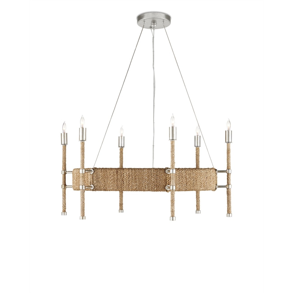 The Monzie Chandelier has a surprising mix of contradictions: the rope-wrapped frame and stems are warm elements of the design, while the contemporary silver leaf finish on the steel is bright. The way the stems are cleverly fitted to the wide band is a highly-refined design element; as are the caps at the bottom of each, the clasps on the fasteners, and the modern bobeches. Adjustable from 30" to 95.5" with use of included chain/rod kit/cable. If your space calls for a longer drop, additional chain/rods/cable is available for purchase.