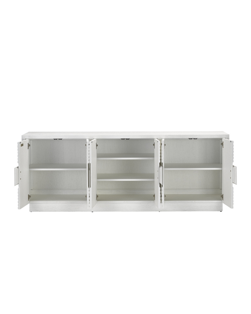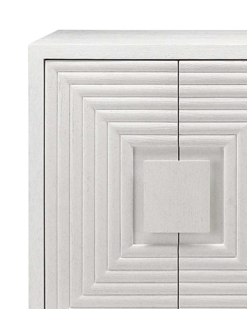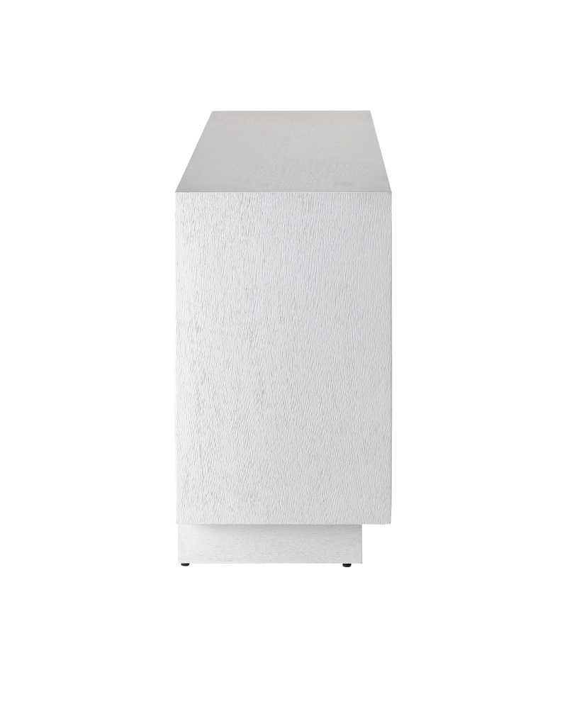 The cerused white finish on the Morombe White Credenza, made of white oak, highlights the patterns of natural wood that form embedded squares in a geometric illusion of depth. The centuries-old finishing technique is designed to draw out the detail and character of the wood grain on this on this white credenza.