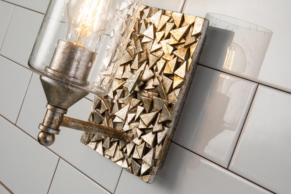 An eye-catching bath bar inspired by our Mosaic collection, with an antique silver rectangular backplate and seeded glass. This charming vanity light blends beauty and function, securely attaching to walls with matching silver details.