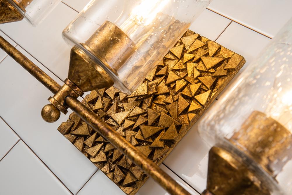 An eye-catching bath bar inspired by our Mosaic collection, with an antique gold rectangular backplate and seeded glass. This charming vanity light blends beauty and function, securely attaching to walls with matching gold details.