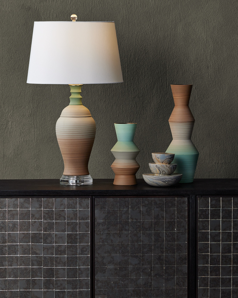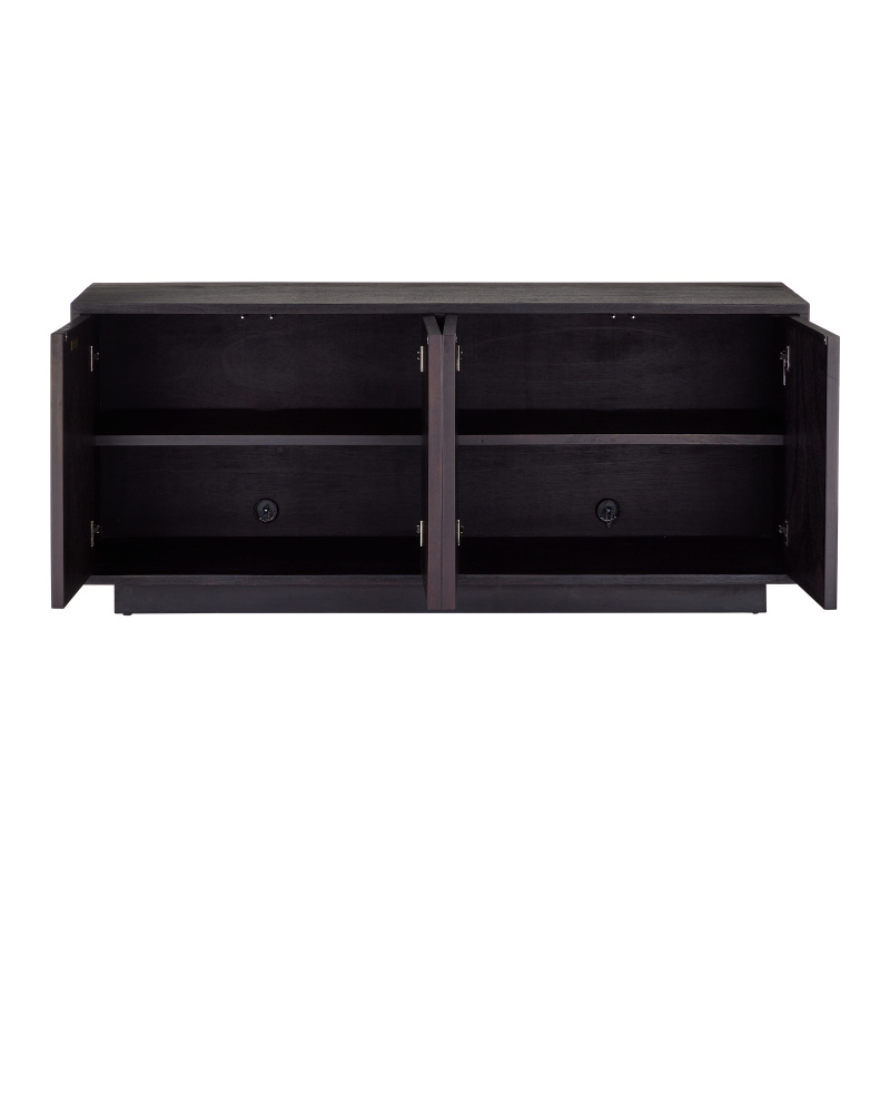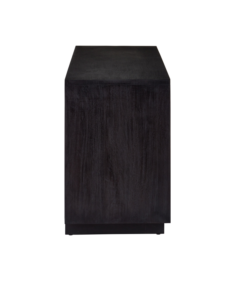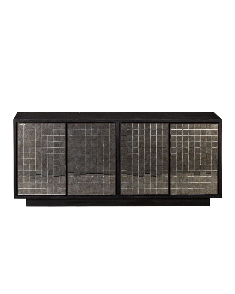 The Mosaico Credenza blends texture, craftsmanship, and timeless style. Its doors are clad in a mosaic of antique mirror tiles individually hand-placed to fit seamlessly in a black wood frame. The mirrored cabinet sits on a plinth base that adds a refined detail, as does the combination of aged mirror surfaces and contrasting dark wood.
