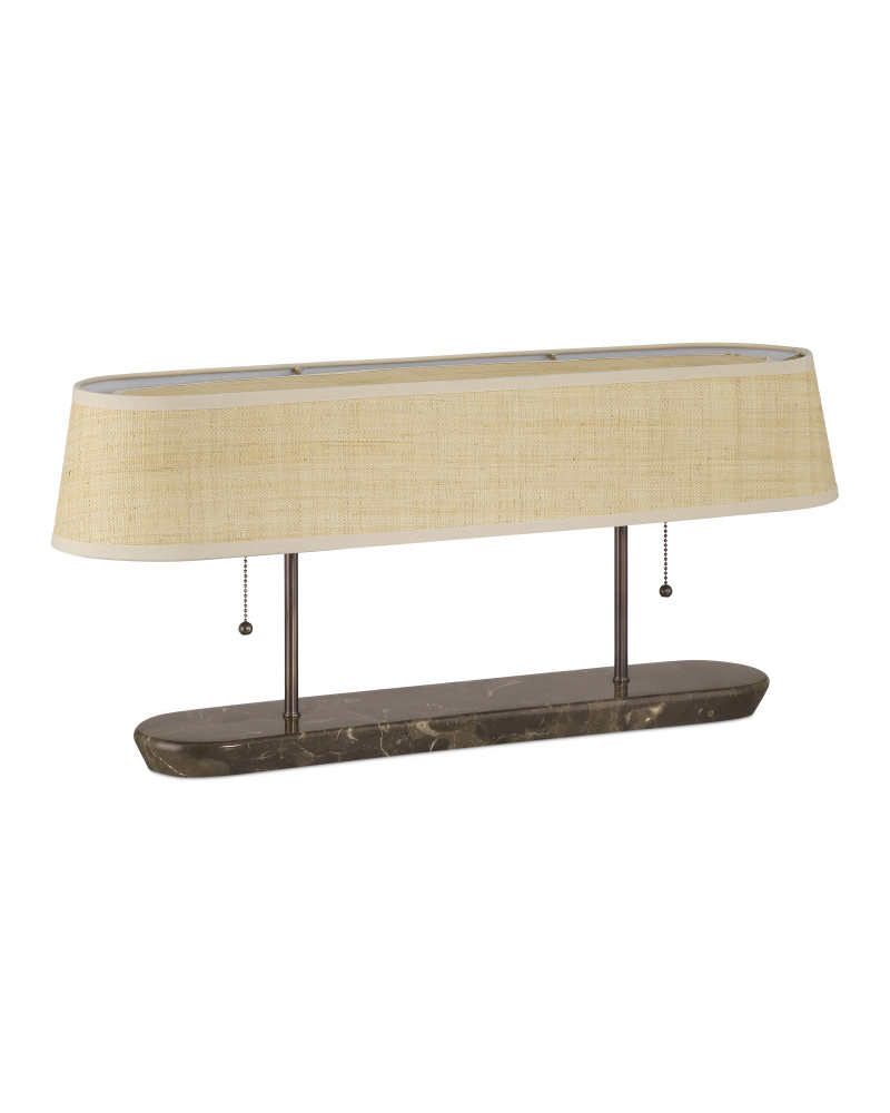 The Museum Desk Lamp draws from the iconic designs of the mid-century modern era, which was characterized by clean lines, organic forms, and a focus on functionality. Made of brown marble with ivory and cream veining, the lamp longer than it is tall. The woven rattan shade fitted to the two-light lamp and the pair of pull-chains are also reflective of the era. The metal in a dark bronze finish coordinates with the marble, which will vary slightly from lamp to lamp.