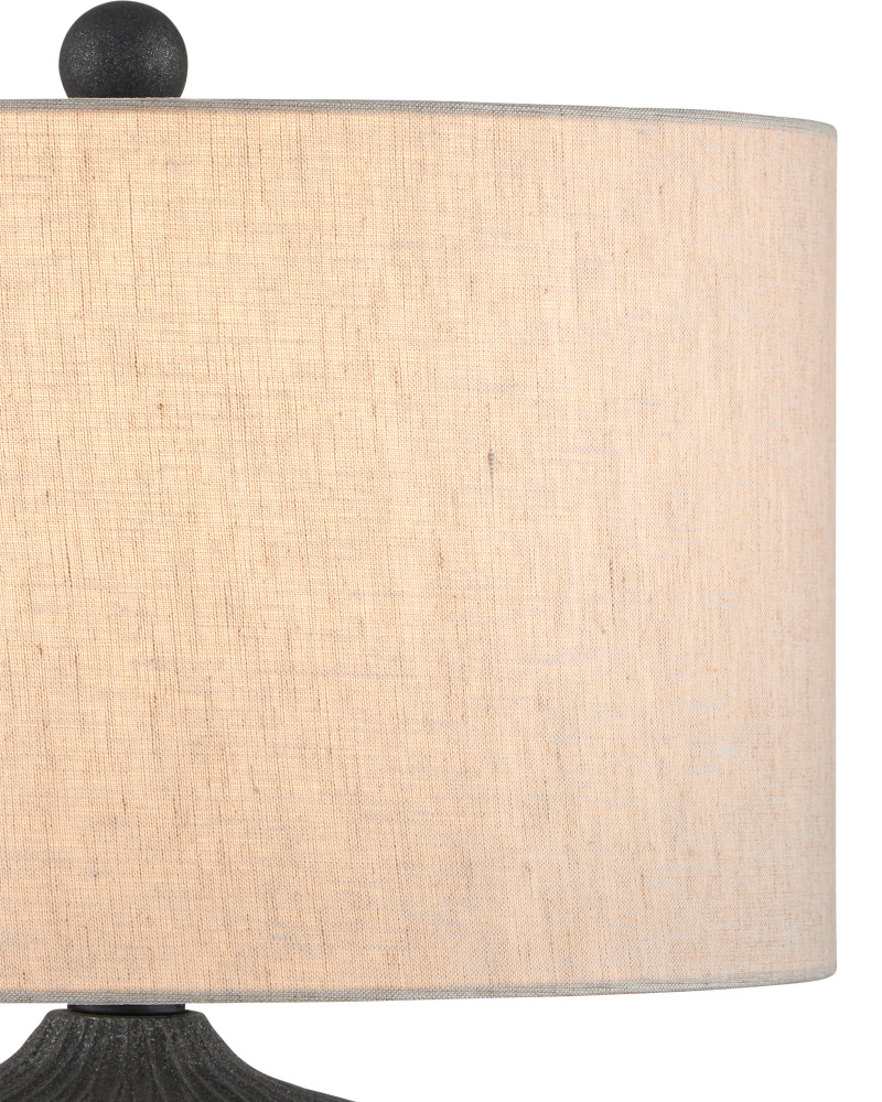 The Mythmaker Table Lamp lives up to its name, as its squashed circular body is made of terracotta in a mix of satin black and black granite finishes that make it look as if it has been forged of iron. Though there is a slight aged feel that brings the lamp added texture, it is still modern in its lines. The oversized shade paired with the flatness of the body is a stylish design detail, as is the matching finial that fastens the shade to the lamp.