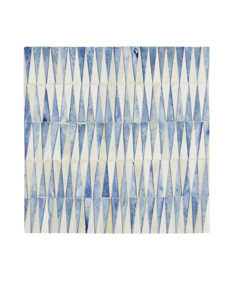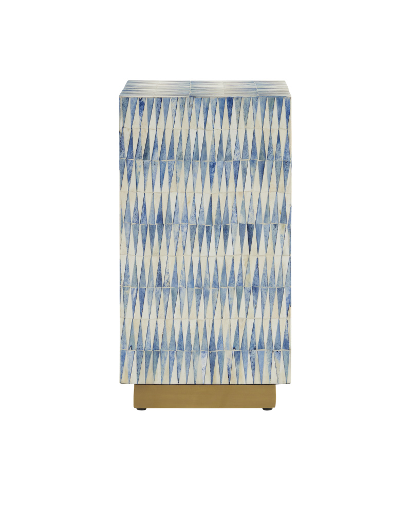 The Nadene Blue & White Accent Table is a decorative side table made of alternating colors of bone. The jagged pattern is created when blue and ivory bone are hand-applied to the surface, making the blue occasional table an artisanal accent that packs a textural punch. This complex composition sits atop a brass plinth base that adds to its sophisticated profile.