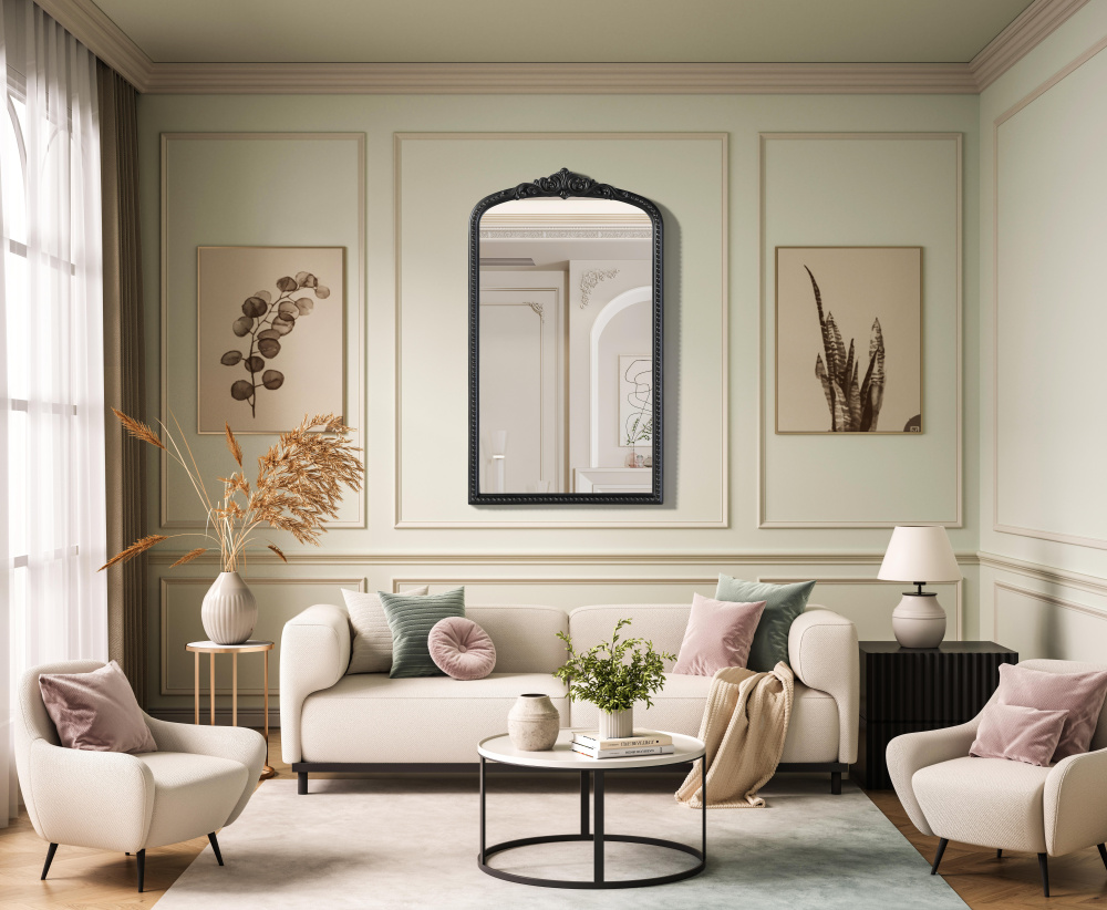 The mirror features a softly curved arch at the top, adding a refined and timeless touch to any space.