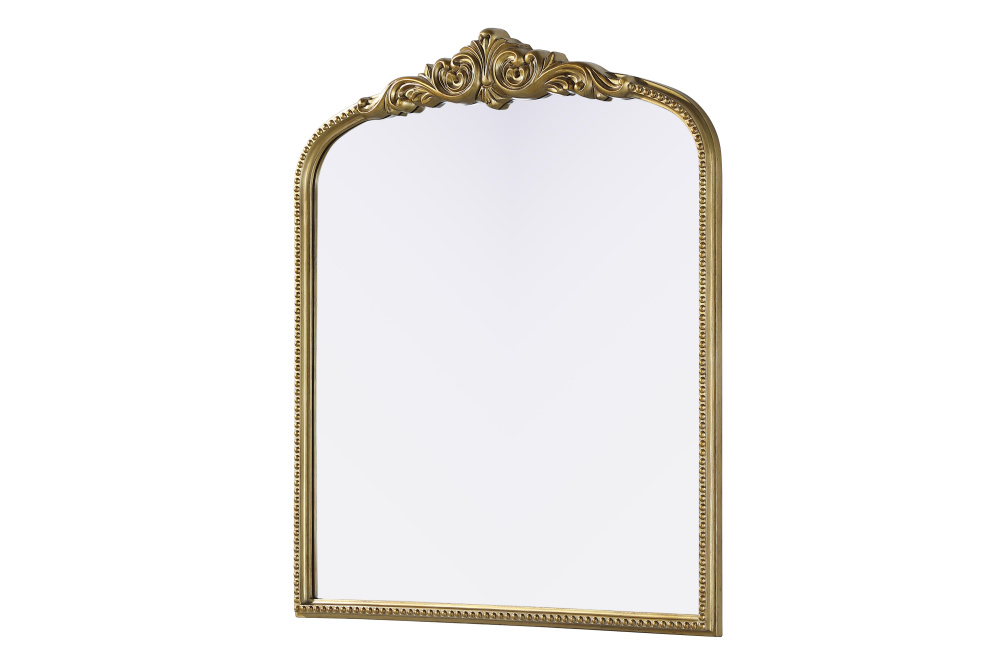 Add a touch of old-world charm to your home with this antique brass arched wall mirror, designed to bring timeless elegance and vintage character to any space. The hand-painted distressed finish gives the frame an aged, classic appeal, while the ornate crest and intricate detailing add a traditional European touch. Crafted from resin with an MDF backing board, this mirror is both lightweight and durable. Designed for vertical hanging only, it features two metal inset hangers for easy wall mounting (hardware not included). Whether placed above a fireplace mantel, in an entryway, or as an accent piece in a living room, this mirror creates a refined focal point. Available in multiple sizes and an alternative vintage bronze finish, it complements a variety of interiors, from classic and French country to vintage-inspired spaces.