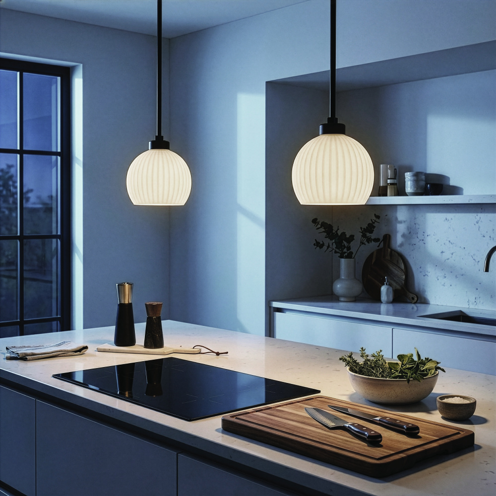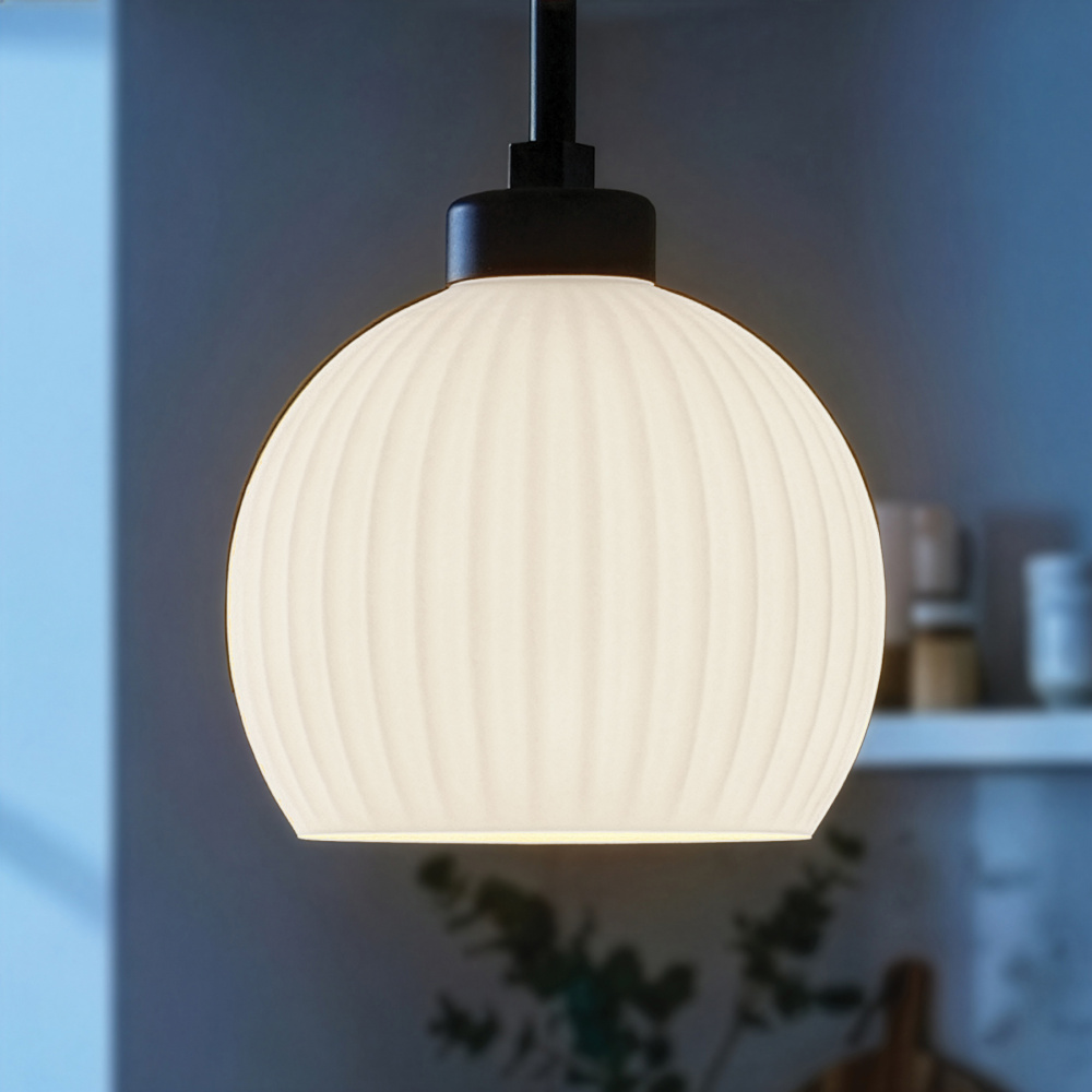 Modern Minimalist Design: A sleek matte black frame complements the softly ribbed flat opal glass shade. The result is a pendant that feels fresh, balanced, and quietly elegant.