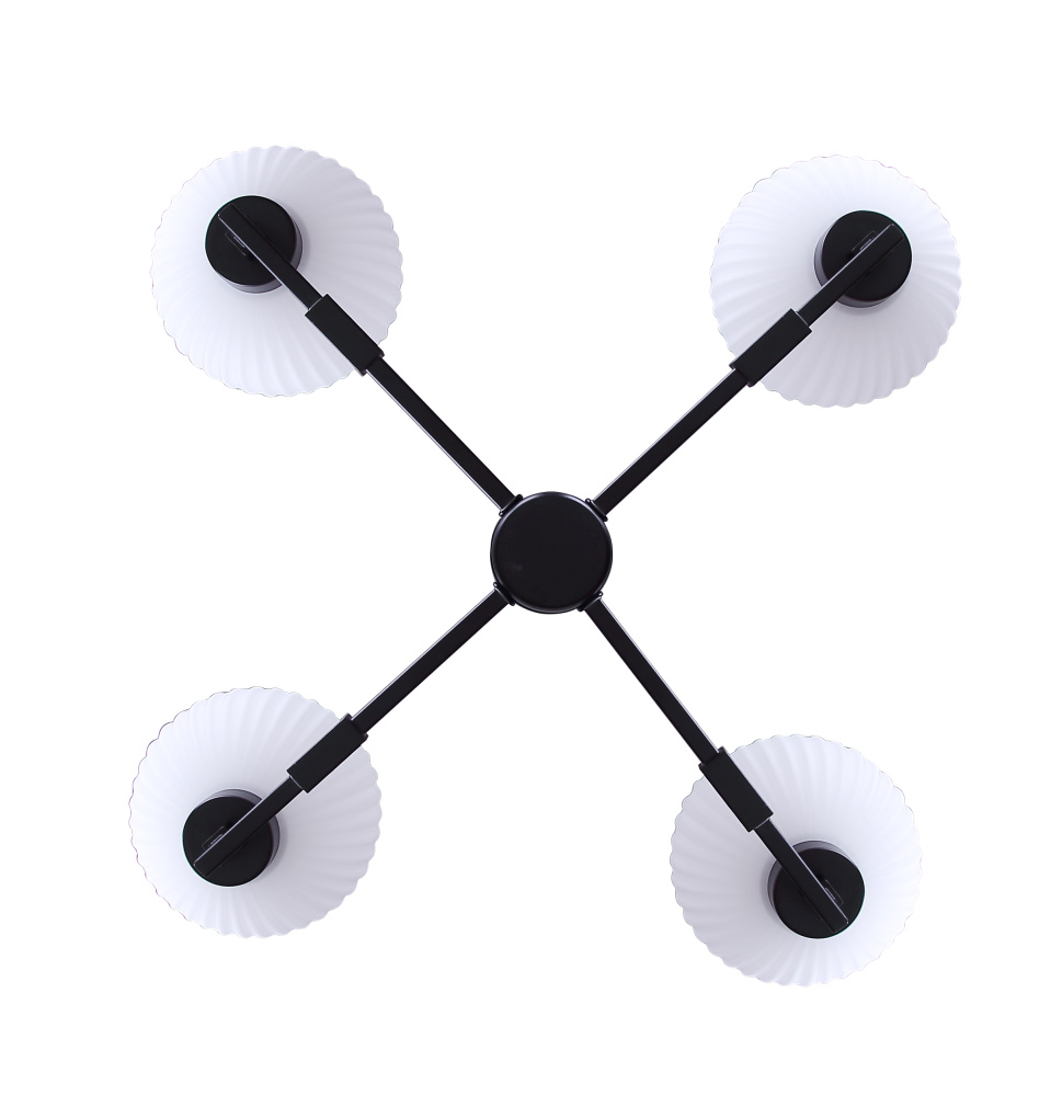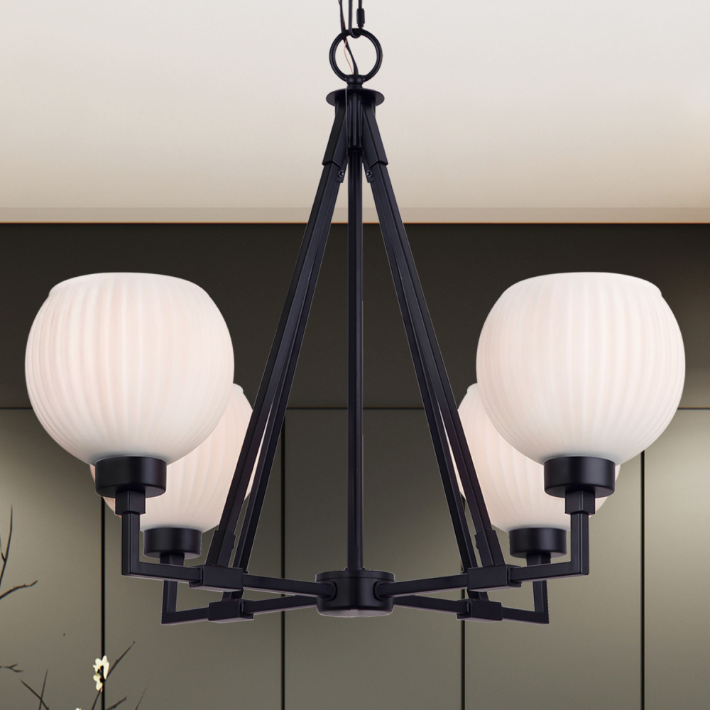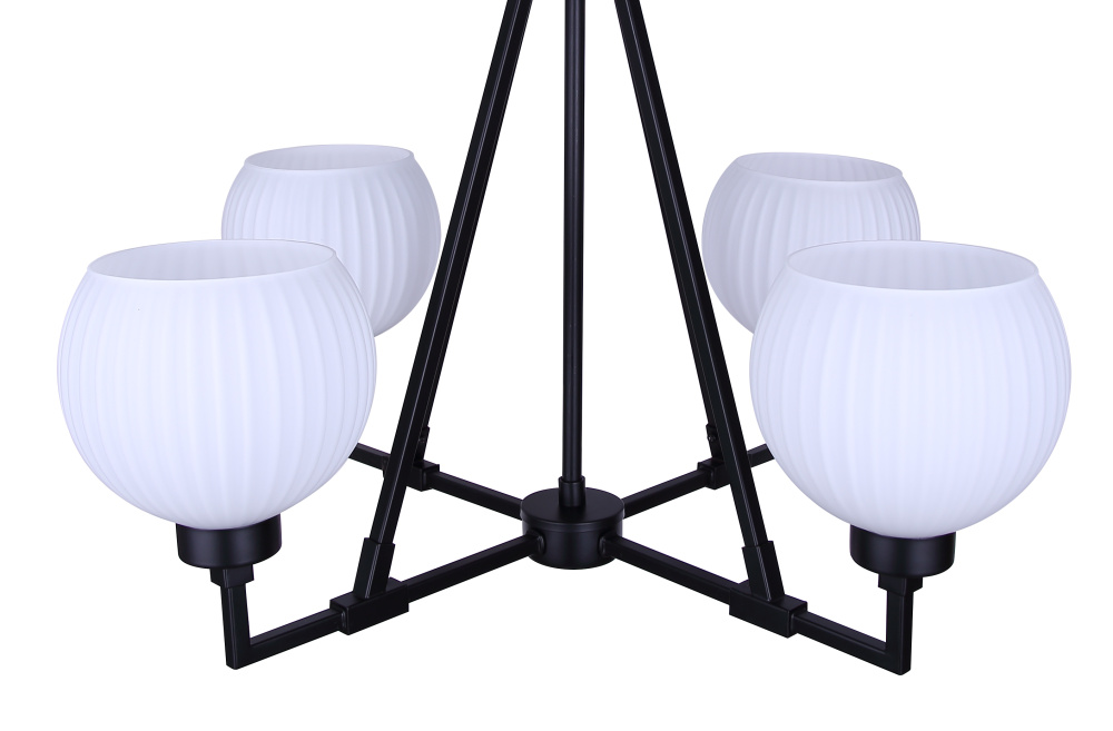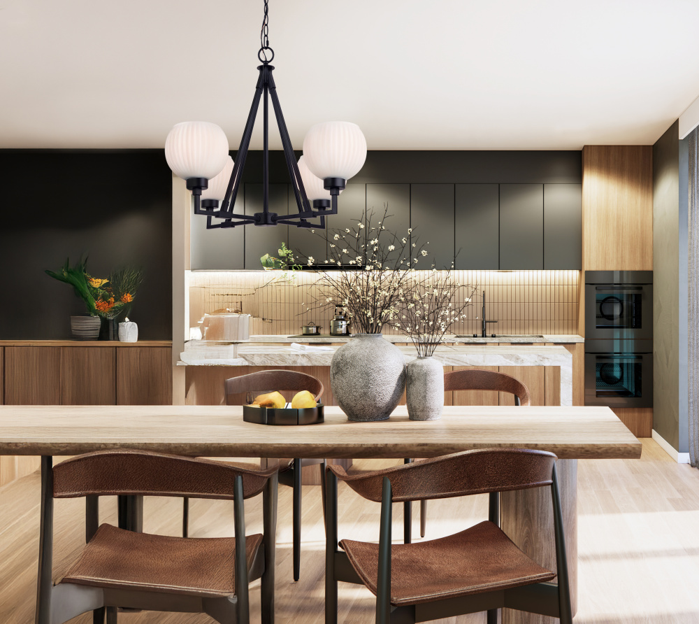 The NELLA chandelier strikes the perfect balance of bold structure and refined detail, pairing a matte black frame with ribbed flat opal glass shades. Its strong industrial-inspired silhouette is softened by the textured glass, creating a fixture that feels both contemporary and timeless. With four lights, it provides ample illumination while maintaining an airy, minimalist presence. Measuring 24.5 inches wide by 19.5 inches high, this chandelier makes a striking statement in dining rooms, kitchens, or entryways. Elevated yet understated, NELLA brings a touch of luxury to modern interiors.