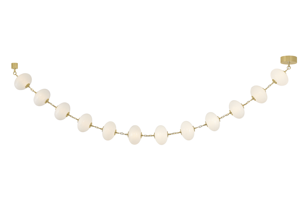 Echoing the artistry of bespoke installations and the graceful allure of fine jewelry, Nephele floats elegantly in space, resembling a string of luminous pearls suspended in perfect harmony. Each softly glowing cloud glass orb is held in place by intricately detailed Vintage Polished Brass links, creating a striking interplay of light and form. Available in 8, 12, or 16-light LED-lit chandeliers, as well as a 1-light wall sconce, Nephele captivates the senses with its fluid silhouette and exquisite craftsmanship. This artful statement piece offers a refined elegance that elevates interiors with its sculptural presence.
