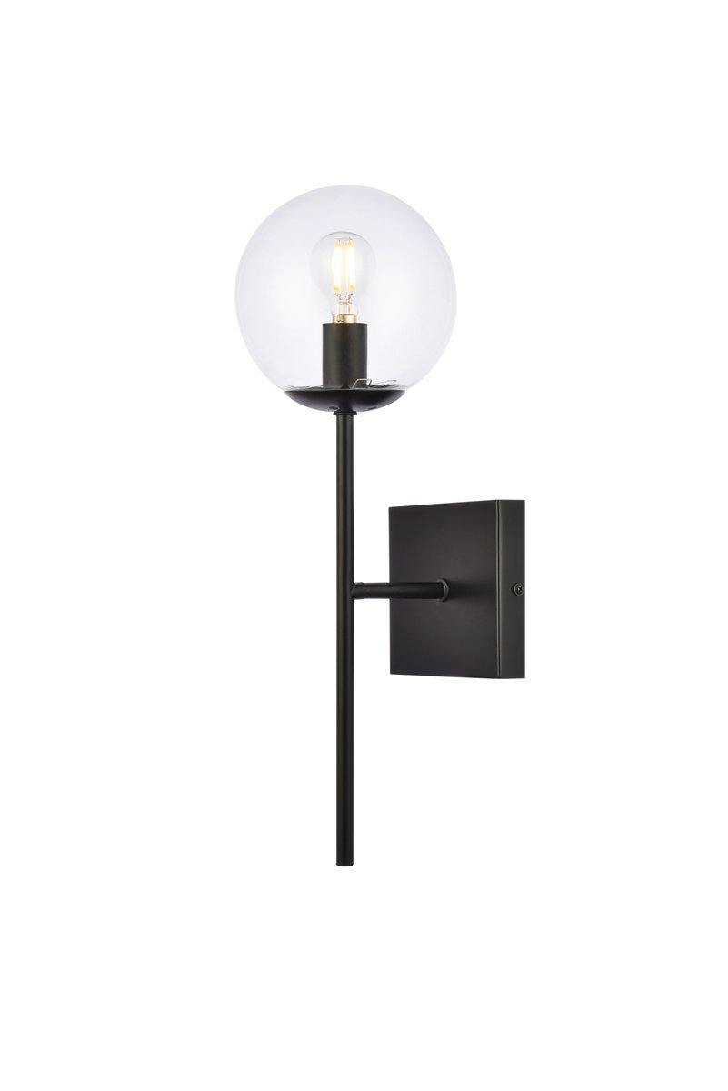 One clear glass globes accents the metal arm sconce