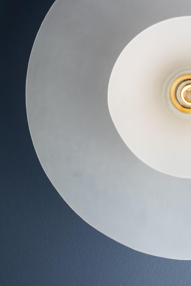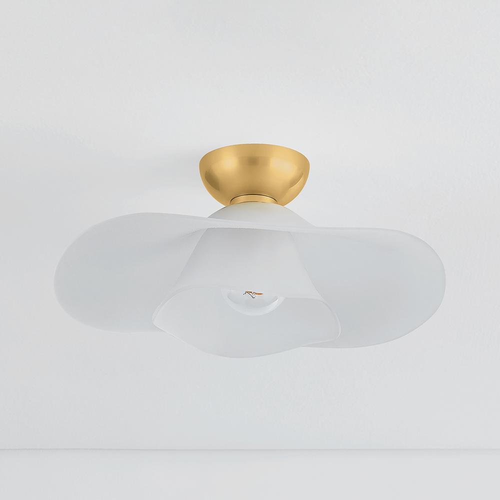 Two shallow, undulating glass shades are nested together to create the dynamic, flowing silhouette of Netherlee. This ethereal flush mount is inspired by a flower in bloom, bringing an organic, artistic touch to living and dining spaces. The Aged Brass ceiling canopy complements the airiness of the shade with a luxe quality.