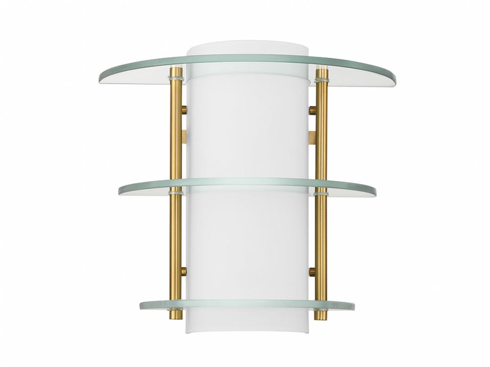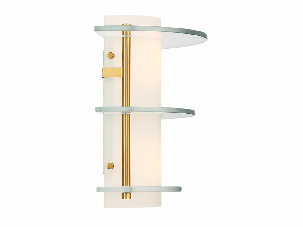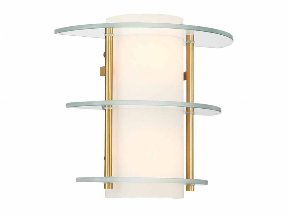 The Newell 2-light sconce from Savoy House is a standout example of Art Deco style. Three sleek discs of clear glass surround a core shade of opal glass to create a bright and intriguing glow. The Warm Brass finish is bright and chic. Newell is 12" in height, 10.25" in width and extends 6.25" from the wall. Uses two candelabra size bulbs of up to 60 watts per bulb. Bulbs not included. This sconce is damp area rated.