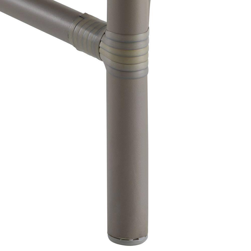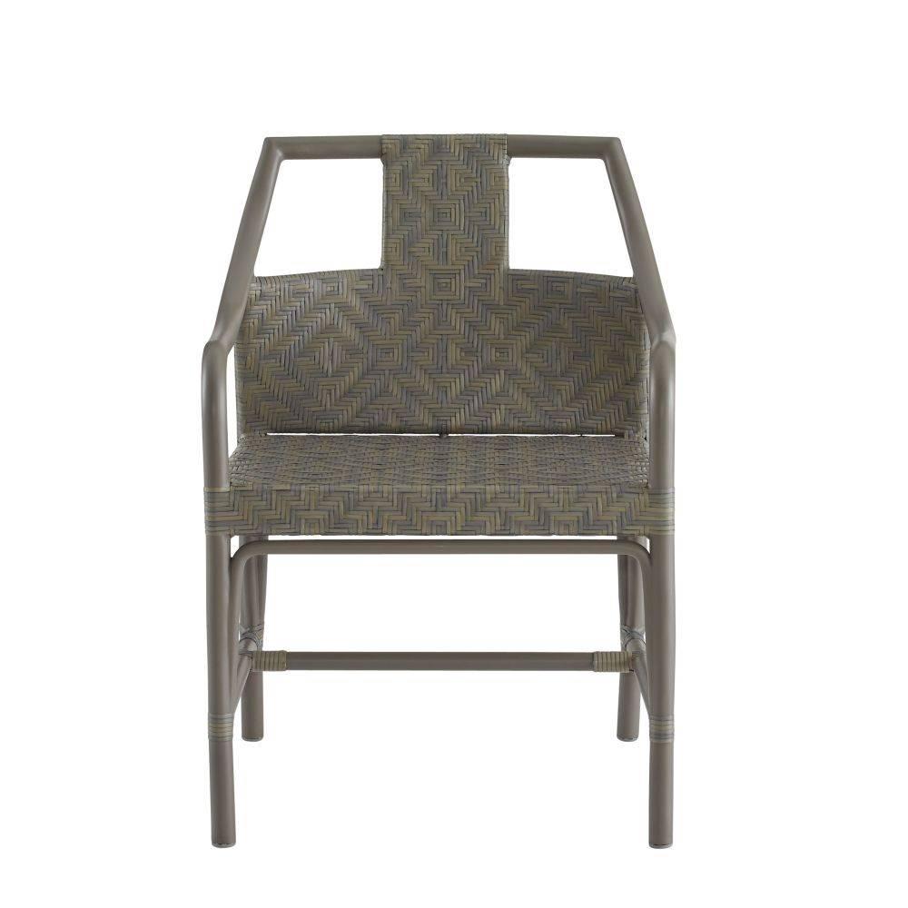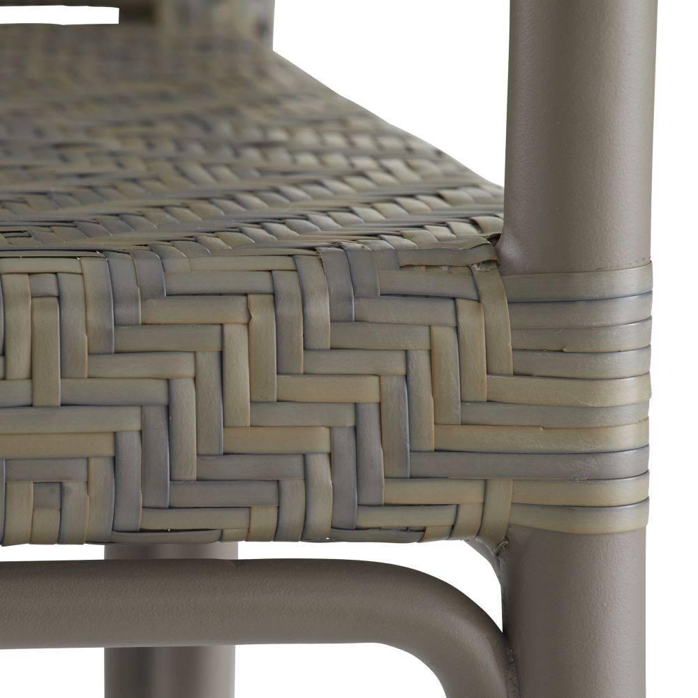 A casual style of traditional rush-woven synthetic rattan gets a stylish update in element-resistant chartreux grey wicker weave. It features a uniquely designed back detail that resembles a woven tapestry. The matching powder-coated aluminum gray frame is effortlessly balanced for maximum comfort. Finish will vary.