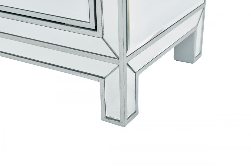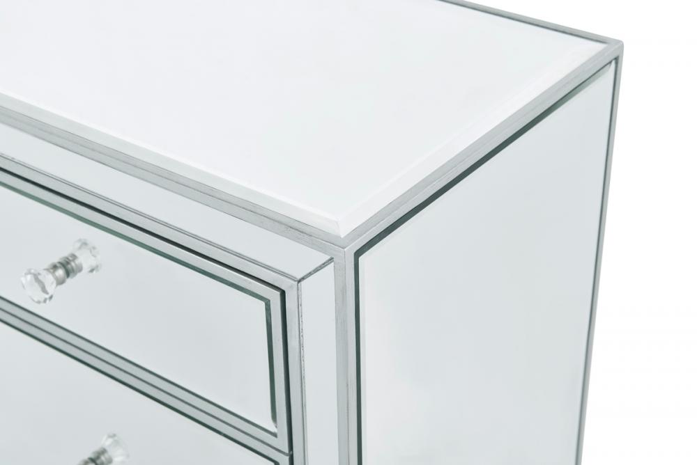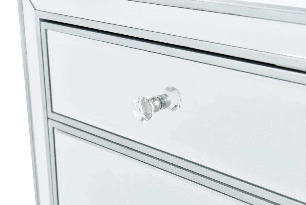 With its sleek lines and contemporary reflective appeal, this cabinet brings elegance and glamour. It provide ample storage space with strong shelving, jewel like crystal knobs, top quality mirror surfaces, and distinctive mitered corners. It combines function and style for any room in your home. FEATURES: *Reflexion collection *1 door *Storage shelf *crystal door knobs *Hand rubbed silver finish *Beveled mirror panel *Solid wood trim and legs *Inside lining painted in silver PRODUCT DETAILS: Measurement L24xW16xH26” *No assembly required *Material in kiln-dried solid wood and engineered wood * 1 year limited warranty.