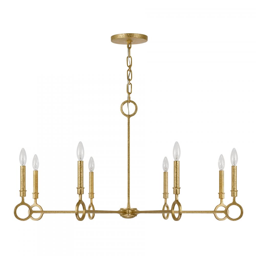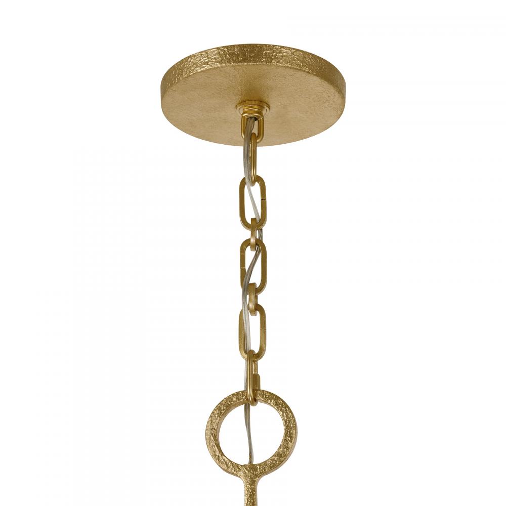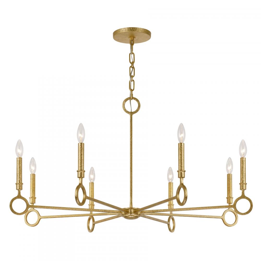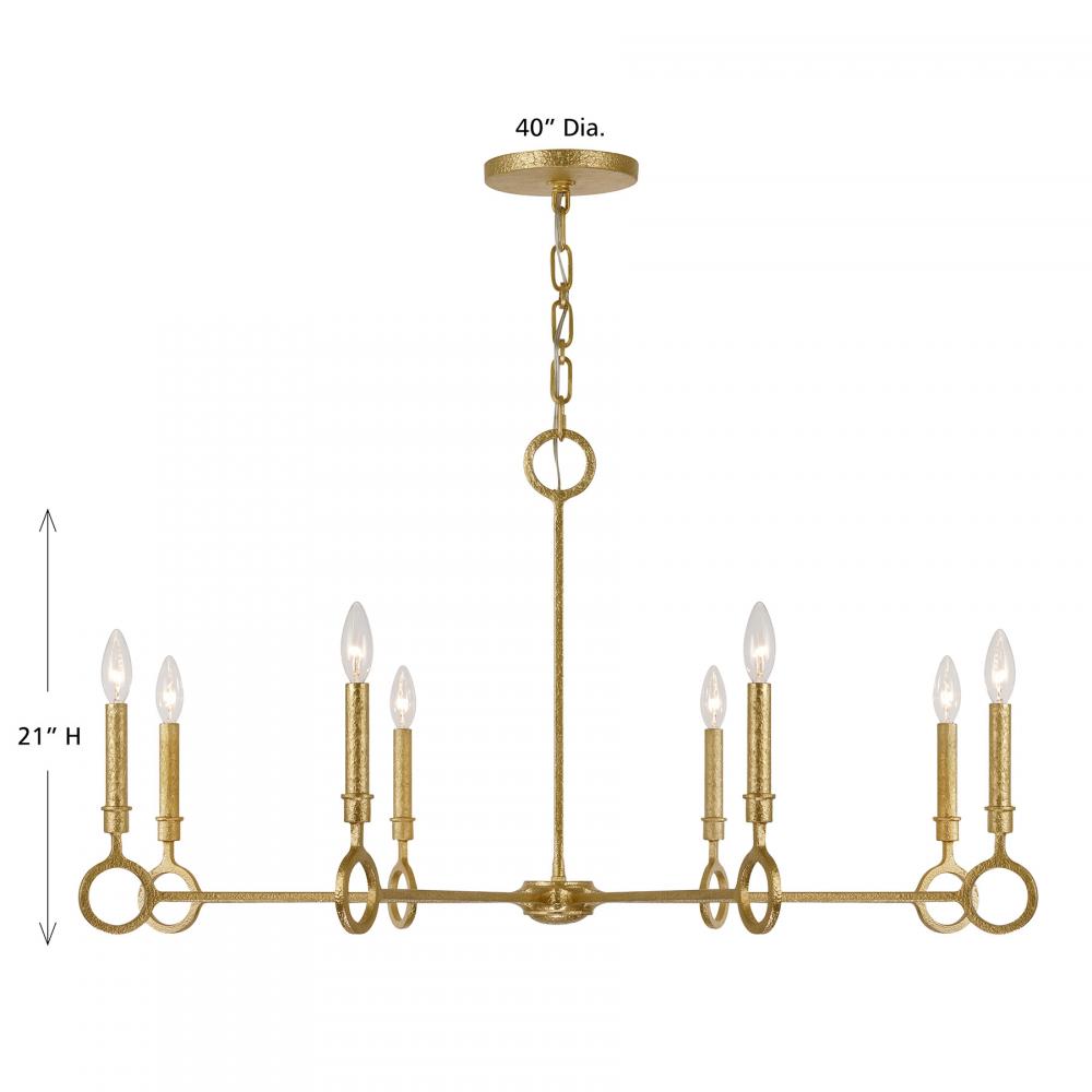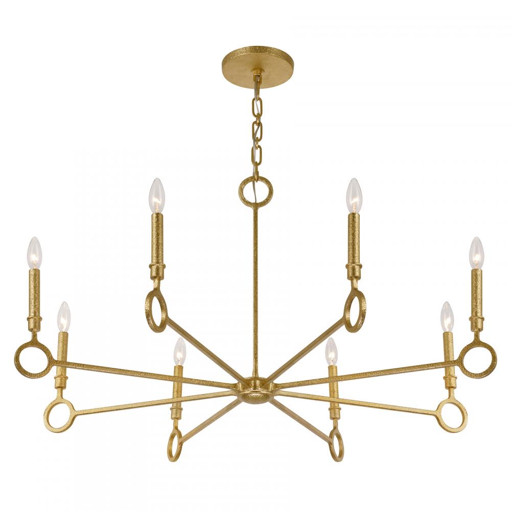 This Savoy House Noah 8-light chandelier was designed by Breegan Jane, an award-winning interior designer and TV host. It flaunts a stately design that is inspired by the timeless, iconic architecture of Spain, which is one of Breegan's favorite places. Simple yet beautiful circular accents bring in geometric intrigue and the unique, hand-applied Gold Armory finish adds a big dose of texture. Noah is 21" in height and 40" in width. It uses eight candelabra-size bulbs of up to 60 watts per bulb. Bulbs not included. Comes with 120" of chain.