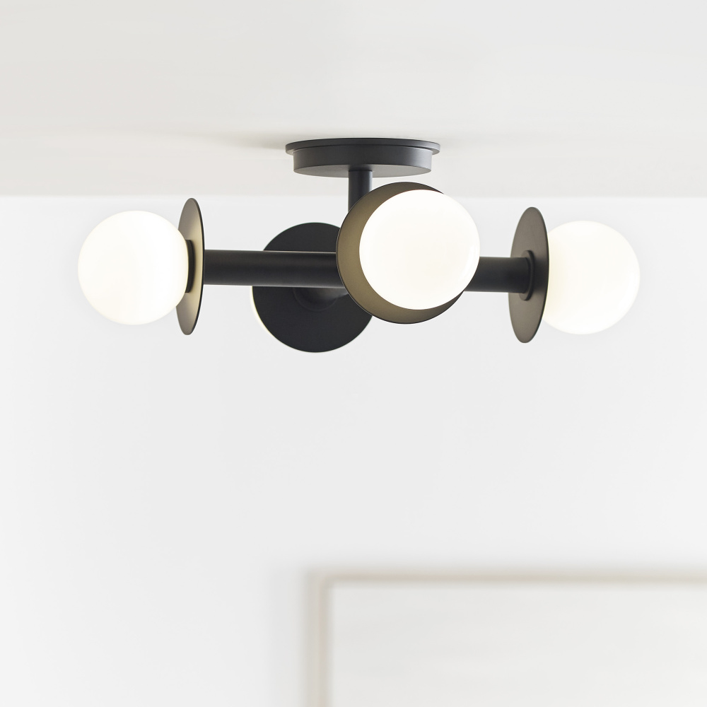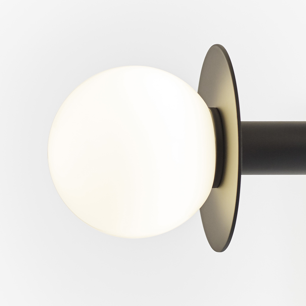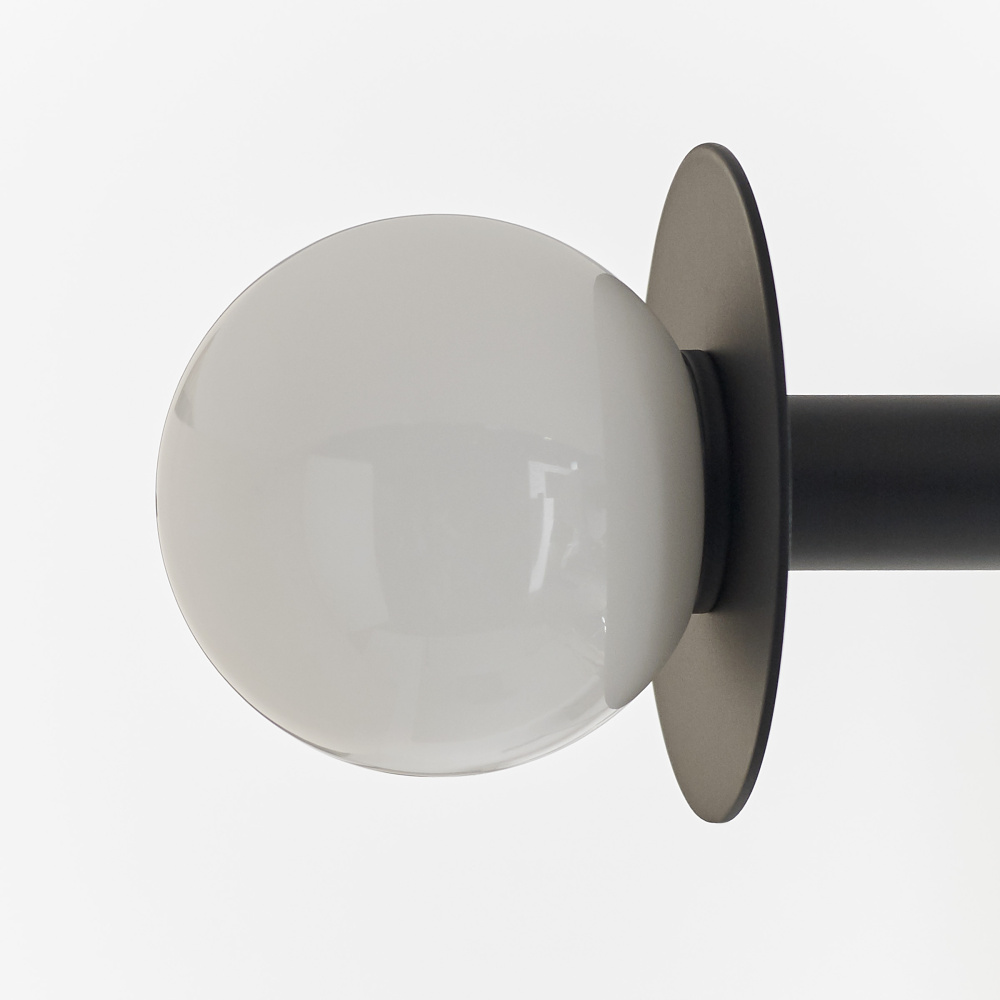 Nodes task, ceiling and wall lighting is minimal yet bold, highlighting Kelly's distinctive juxtaposition of mixed-materiality and curvilinear form. Light radiates from milk glass globes set against metal discs. All fixtures can be used or without the discs. The cast canopy is available in Burnished Brass or Midnight Black. Hanging fixtures within this family feature black fabric cords, while pivot sconces can be cord and plug or hard wire.