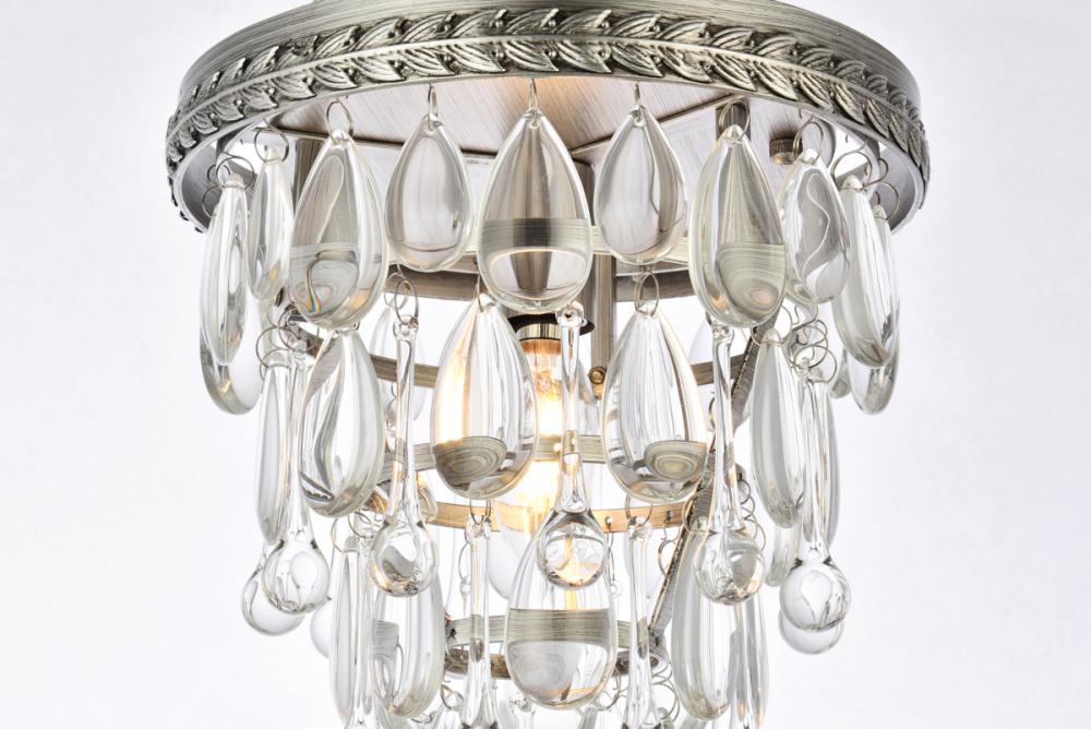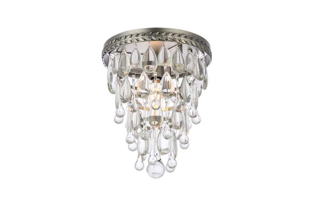 Like icicles reflecting the winter sun, Nordic flush-mount fixtures glisten with royal-cut clear crystal drops illuminated by the soft glow of the candelabra bulb inside. An etched frame base of antique silver bands the descending tiers of icy crystals.