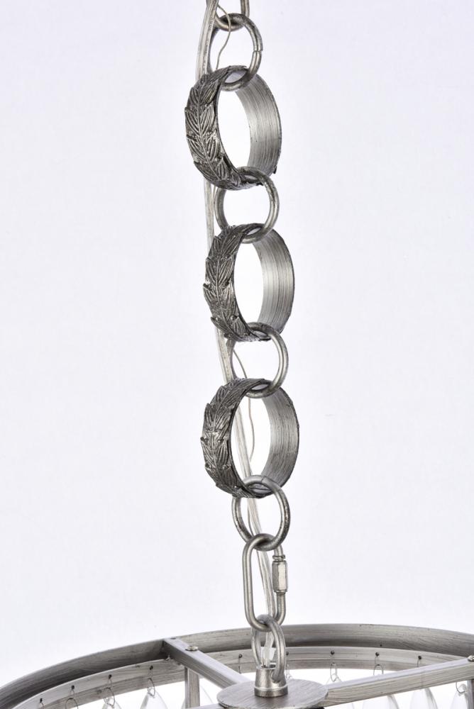 Like the sun setting on a frozen lake, this collection shimmers with tiers of icy crystals reflecting the soft glow of the candelabras. True to its Nordic namesake, the cascades of royal-cut clear crystals complement the etched antique-Silver-finished frame. Suspended by an elegantly looped chain that draws the eye to the cool sheen below.