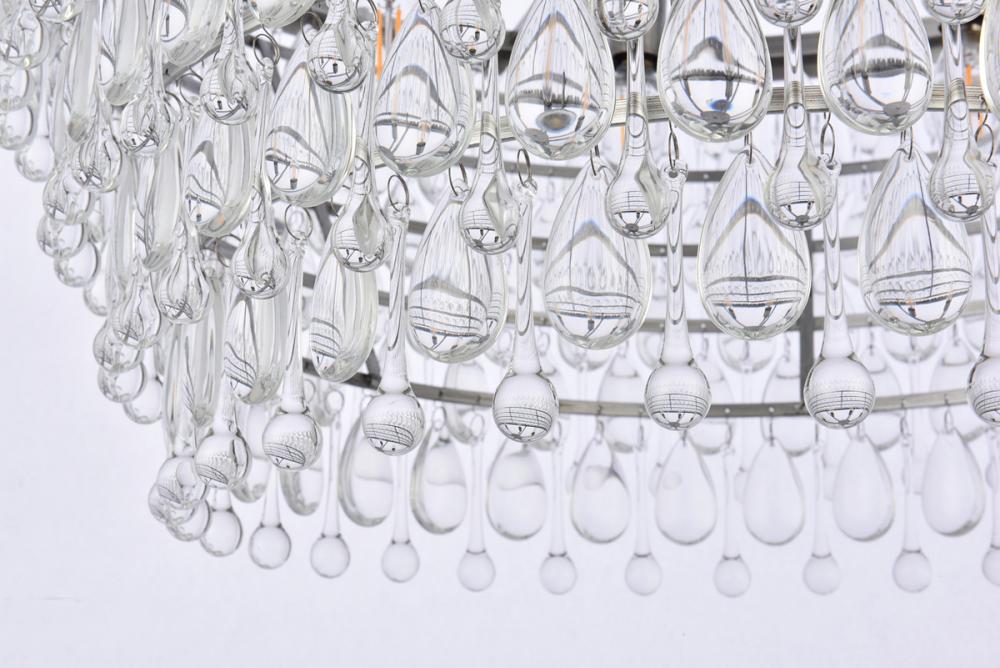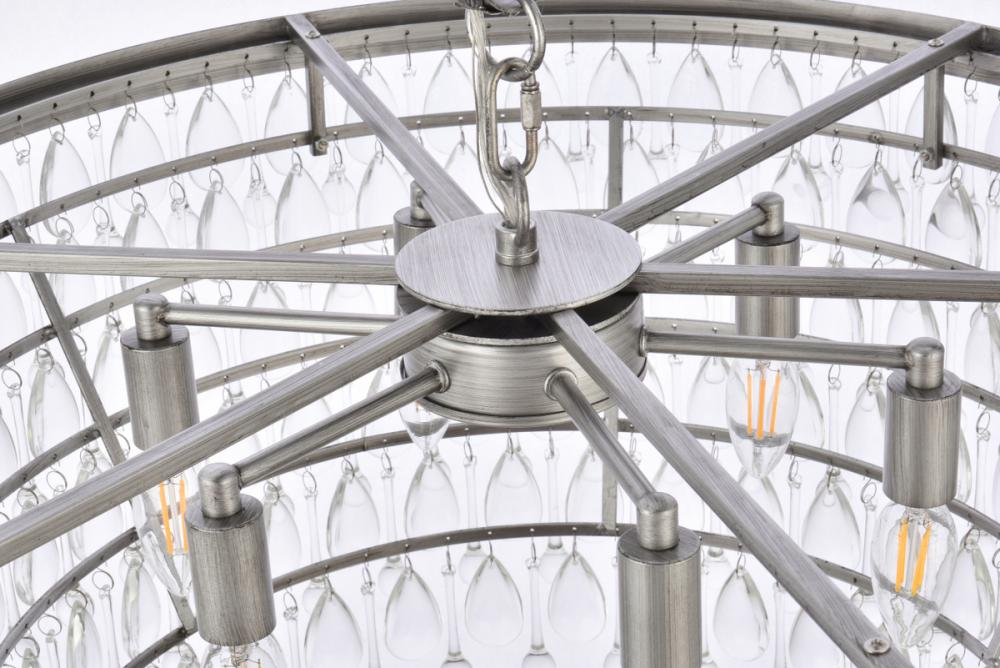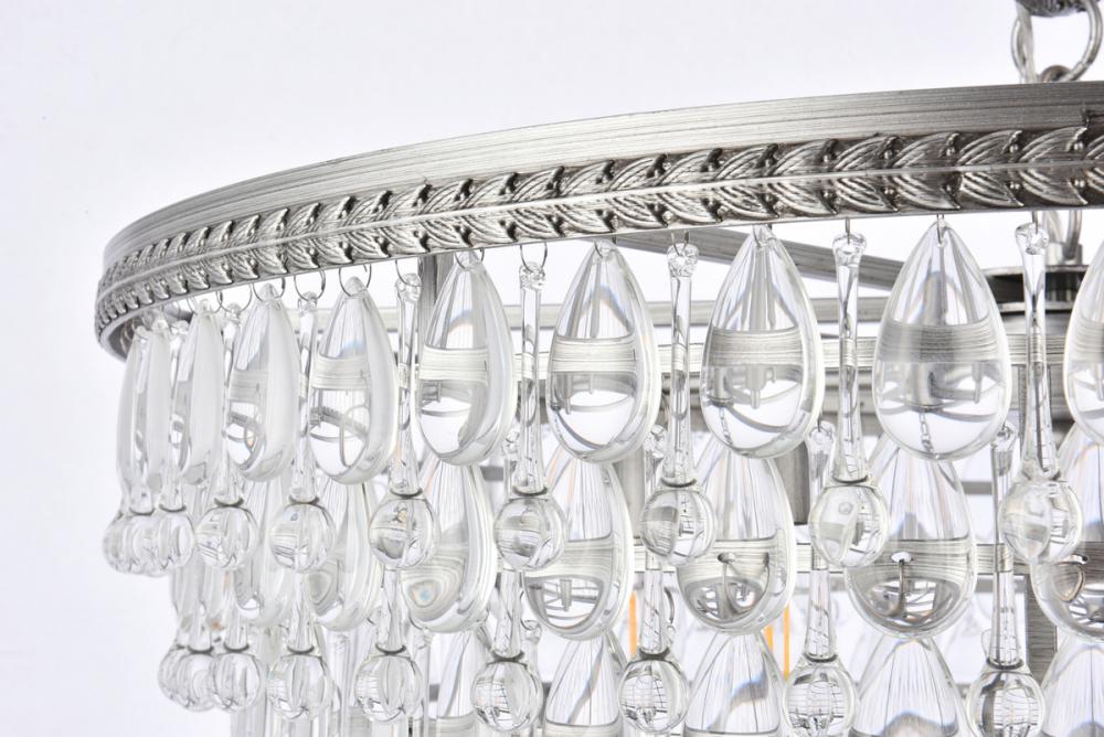 Like the sun setting on a frozen lake, this collection shimmers with tiers of icy crystals reflecting the soft glow of the candelabras. True to its Nordic namesake, the cascades of royal-cut clear crystals complement the etched antique-Silver-finished frame. Suspended by an elegantly looped chain that draws the eye to the cool sheen below.