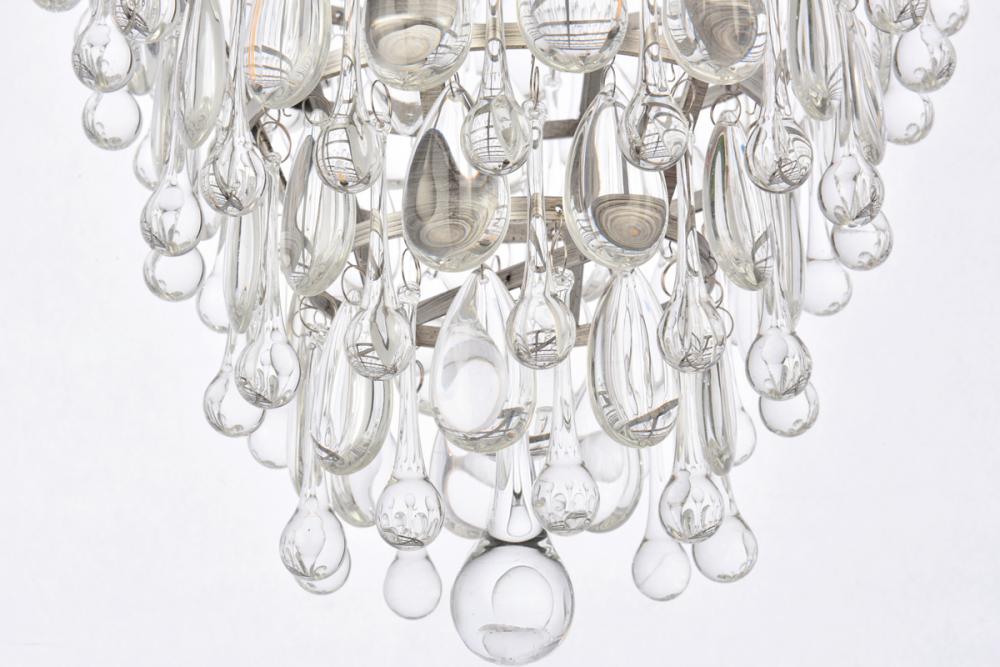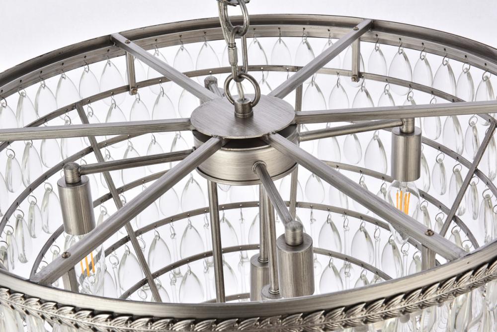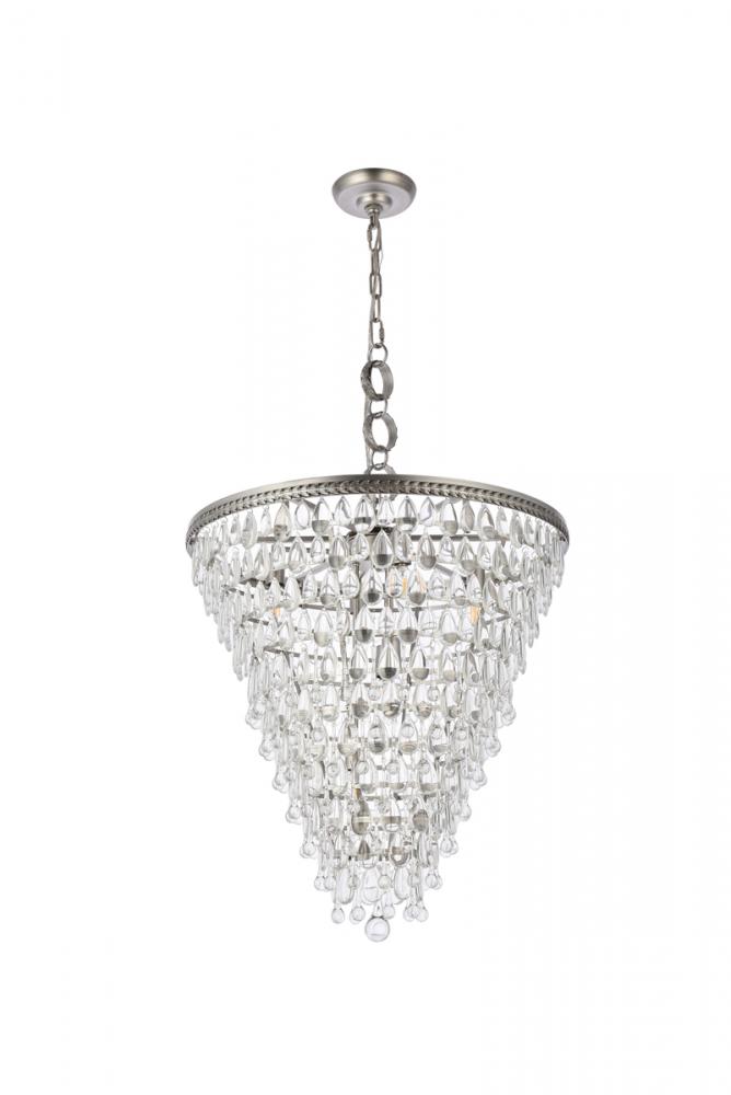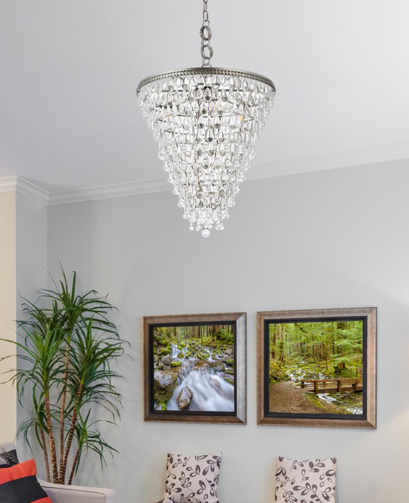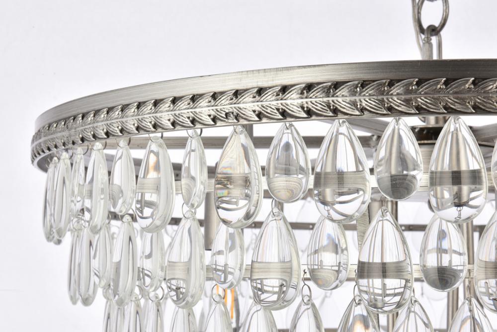 Like the sun setting on a frozen lake, this collection shimmers with tiers of icy crystals reflecting the soft glow of the candelabras. True to its Nordic namesake, the cascades of royal-cut clear crystals complement the etched antique-Silver-finished frame. Suspended by an elegantly looped chain that draws the eye to the cool sheen below.