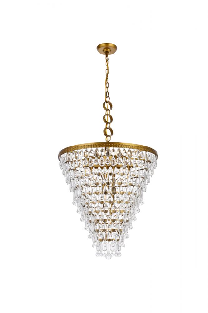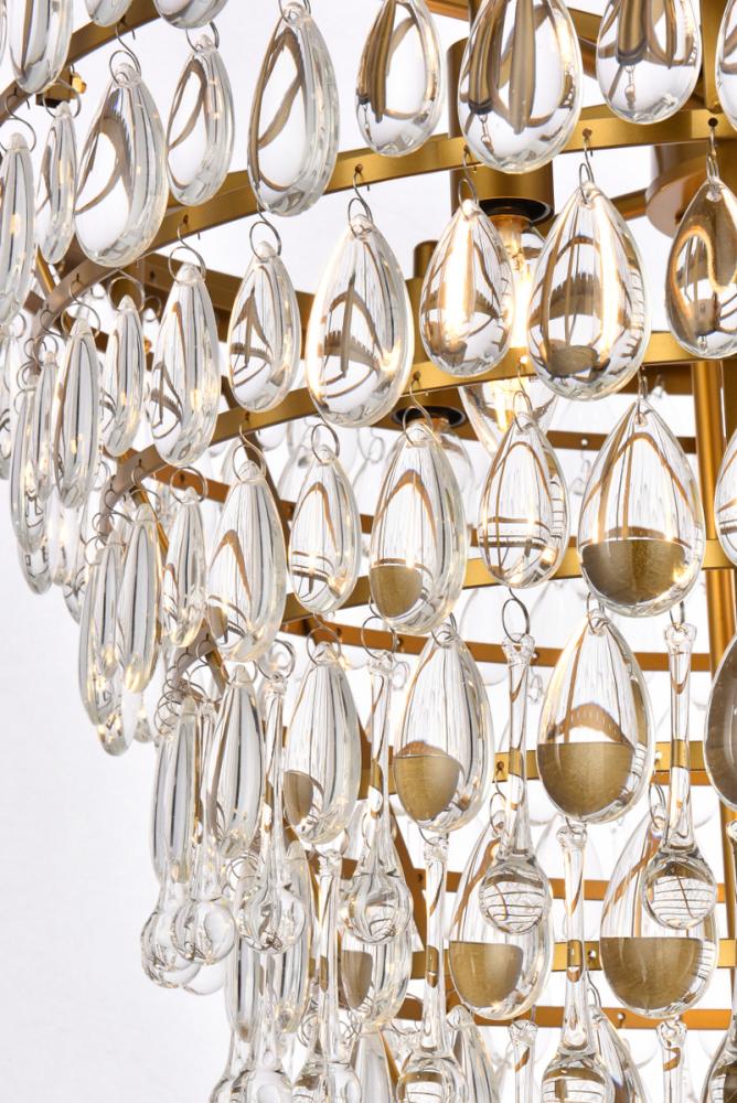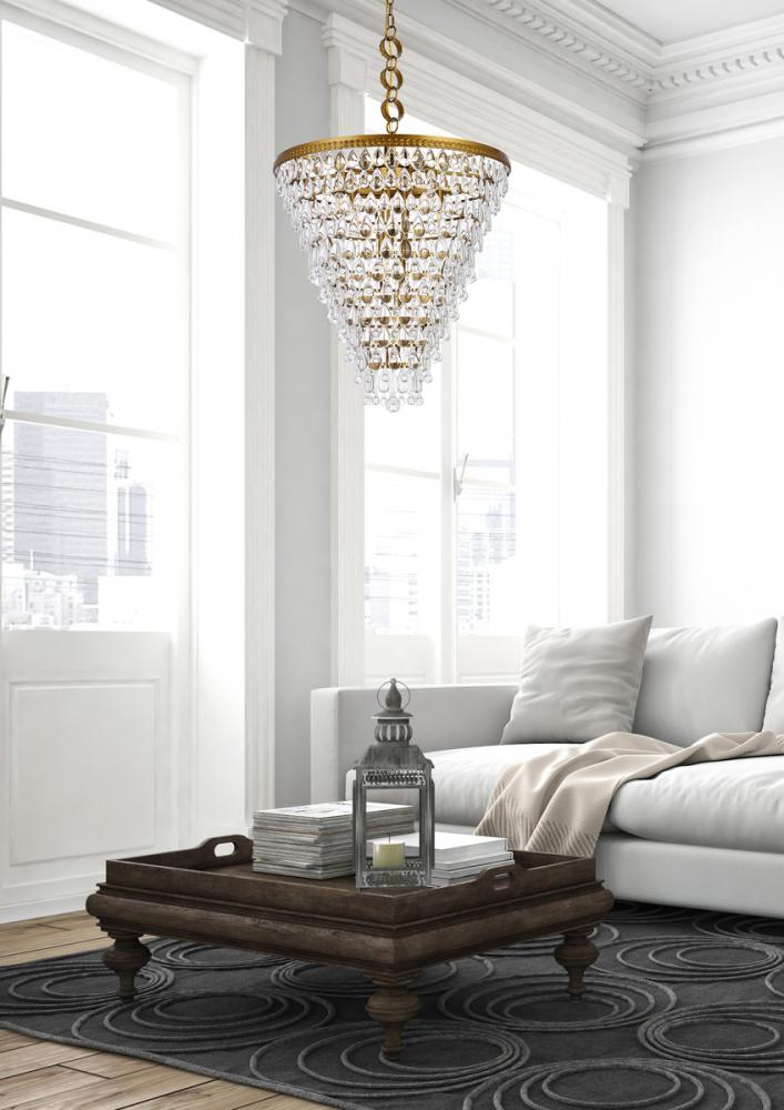 Like the sun setting on a frozen lake, this collection shimmers with tiers of icy crystals reflecting the soft glow of the candelabras. True to its Nordic namesake, the cascades of royal-cut clear crystals complement the etched brass finished frame. Suspended by an elegantly looped chain that draws the eye to the cool sheen below.