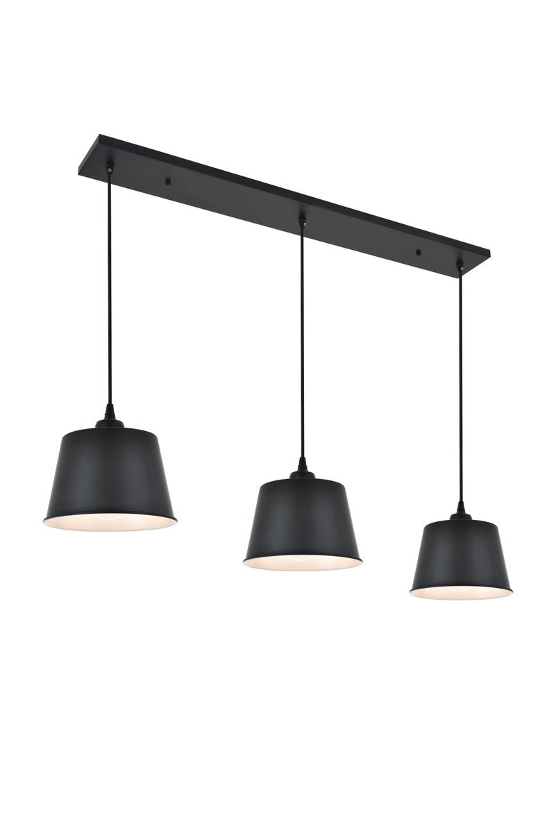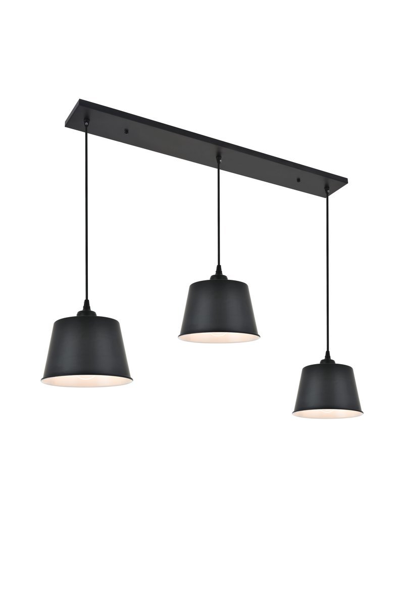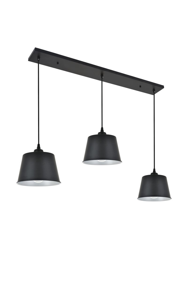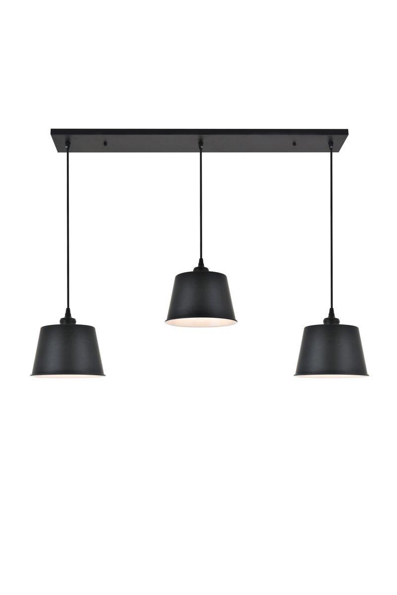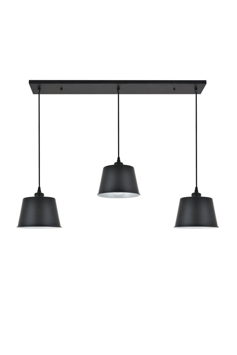Contemporary and minimalistic black finish 3-light pendant light with drum shaped shade suspended from a rectangular canopy