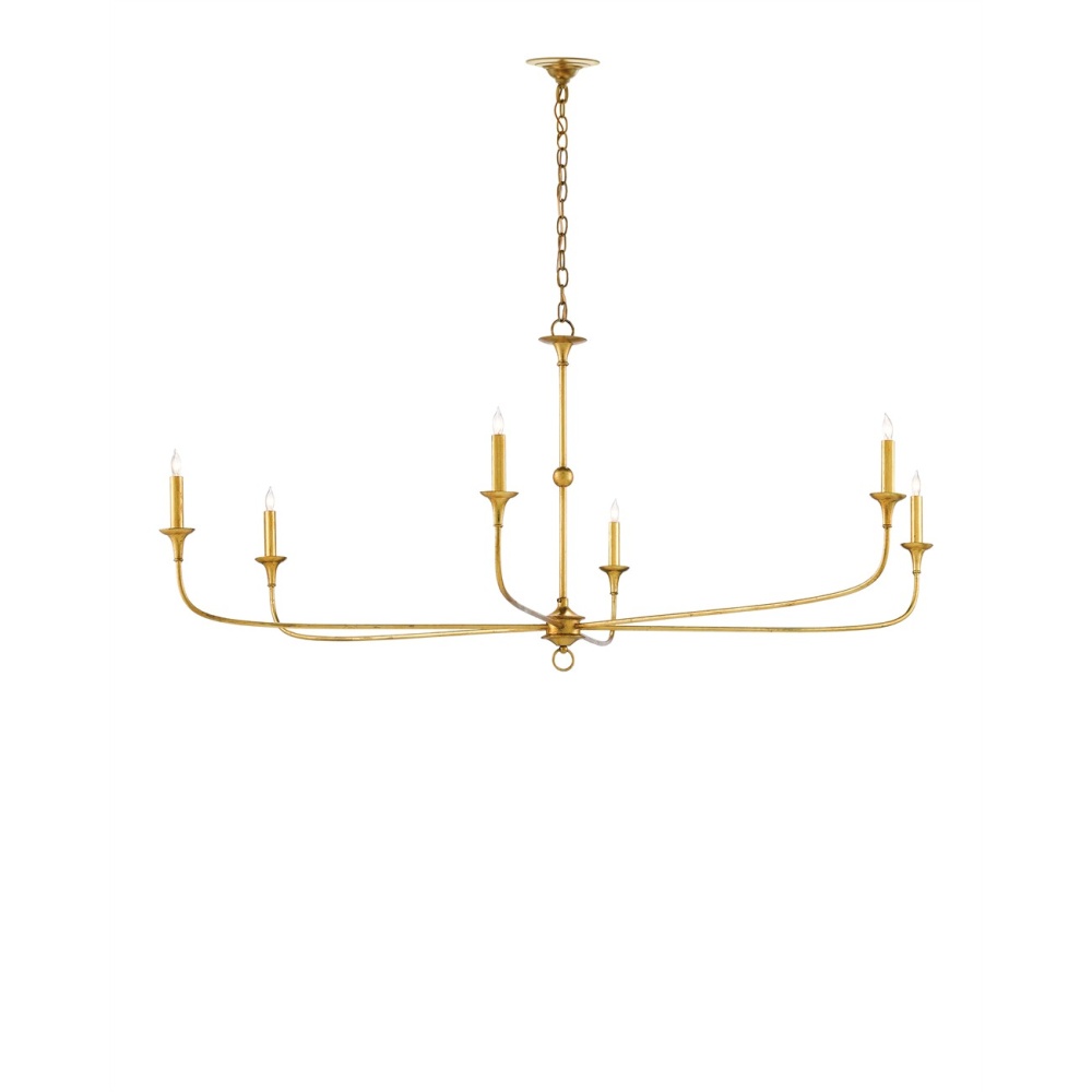 Design notes on the Nottaway Gold Large Chandelier include long arms that stretch gracefully from a small cog and a ring that ornaments its bottom-most point. The profile of the fixture has a lovely fluidity to it, and the contemporary gold leaf finish adds textural interest to the gold chandelier. Adjustable from 32.75" to 99.75" with use of included chain/rod kit/cable. If your space calls for a longer drop, additional chain/rods/cable is available for purchase.