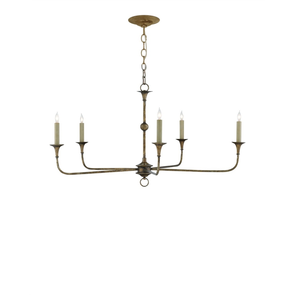 The arms of the small bronze version of our Nottaway Chandelier stretch gracefully from a small cog ornamented with a ring that rests at the bottom of its stem. Though it is a seriously minimalist fixture, the profile of the five-light chandelier has a lovely fluidity to it that makes it a natural choice for traditional and transitional interiors. The Pyrite bronze finish to which the Nottaway has been treated adds textural interest to the chandelier. We offer the Nottaway in a grander version in bronze and in two sizes in a gold finish.