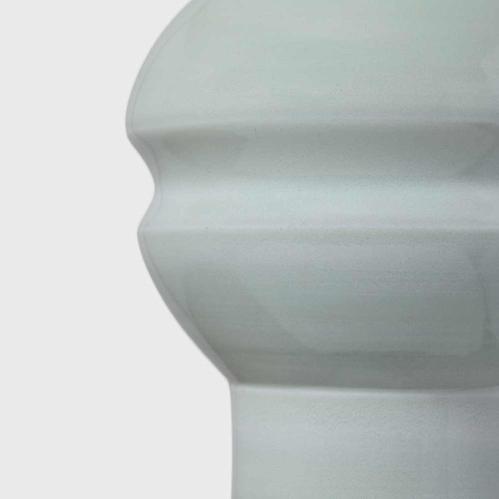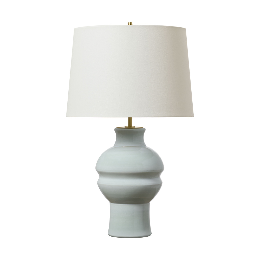 Crafted with Ceramic in a Silk Green finish with white linen fabric shade