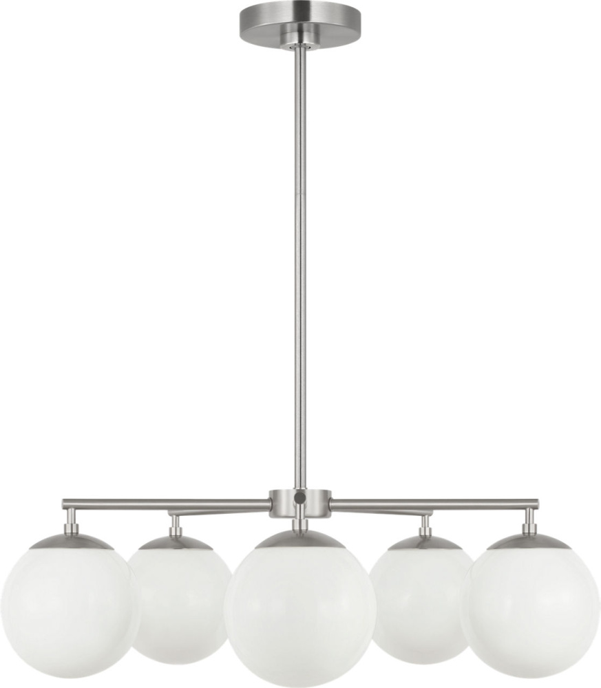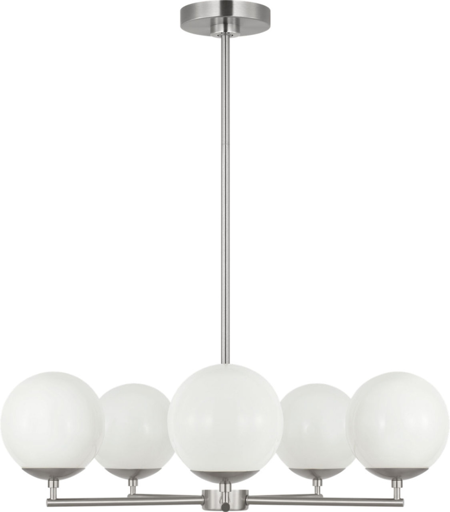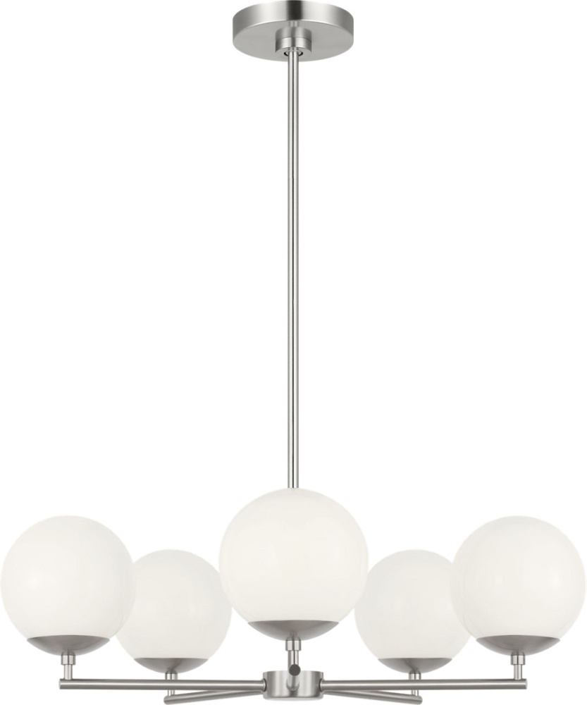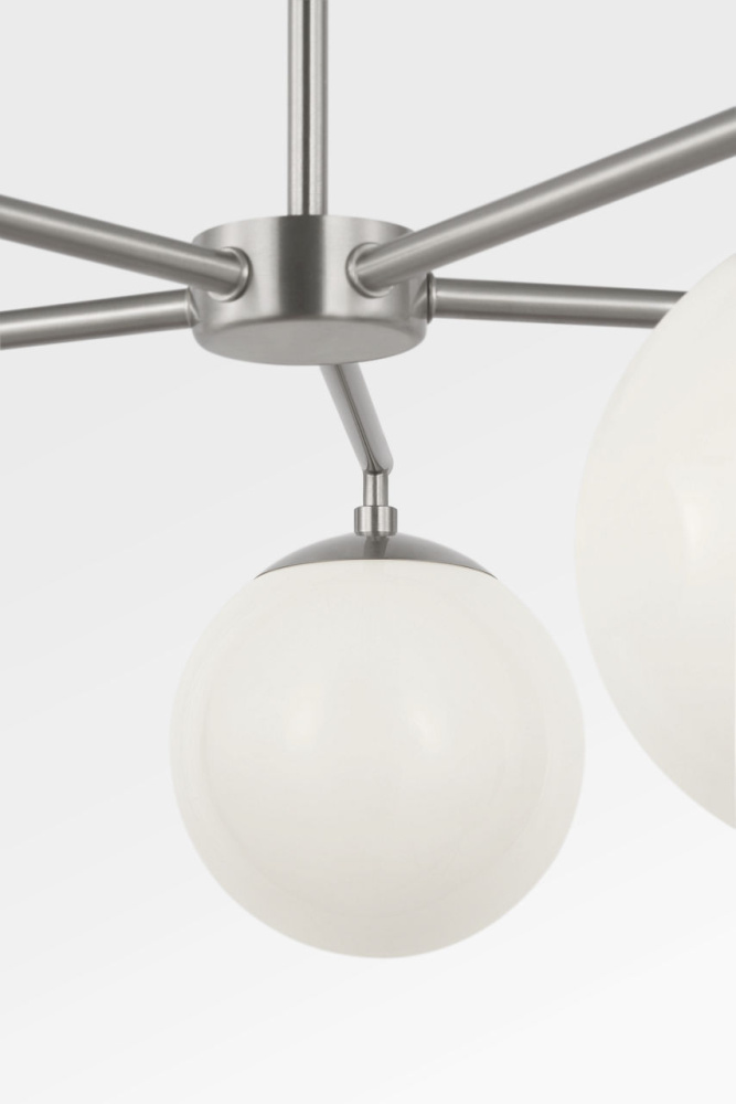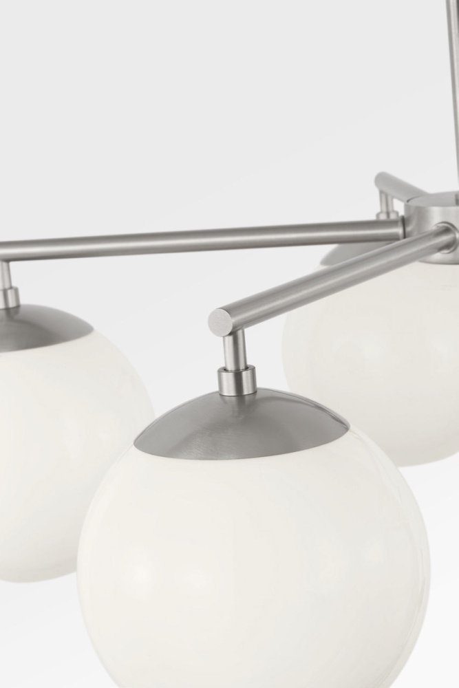 The Nube 5?Light Chandelier presents five milk glass globes arranged around a minimalist central hub. Its reduced scale retains the airy aesthetic of larger variants while suiting dining rooms, foyers, or smaller living areas. The design emphasizes negative space, letting the spheres feel weightless and unobstructed.