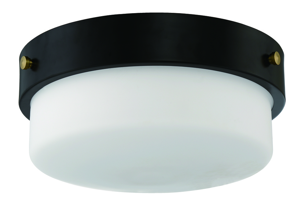 The Oak Street Collection , inspired by strength of classic turn of the century lighting, features a striking combination of sleek metal and white frosted glass in your choice of brushed polished nickel or flat black. The flat black finish includes brushed polished nickel, flat black and satin brass knobs to customize your look. The Oak Street Two Light Flushmount Collection is available in 11" and 13" diameter and each uses two 60W medium base bulbs.