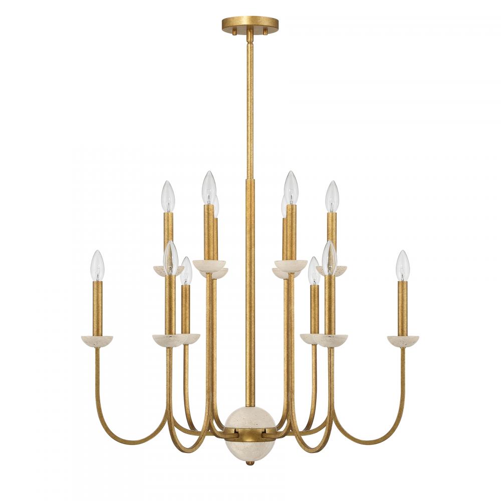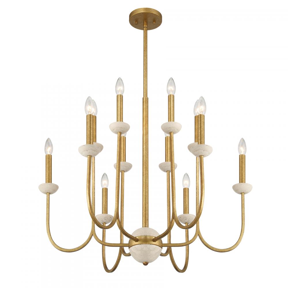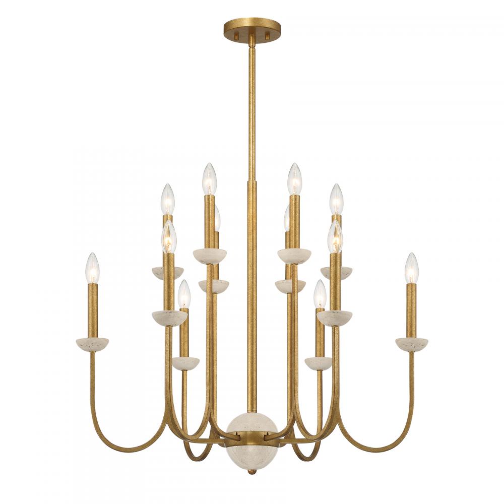 The Savoy House Oakhurst 12-light chandelier expertly blends Art Deco boldness with an inviting organic touch. Dramatically curved arms are topped with candle cups crafted from natural travertine. This beautiful stone features small holes and gaps, an example of the perfect imperfection of nature. An Antique Gold finish amps up the texture and glamour. Oakhurst is 30" in width and has an adjustable height ranging from 25" to 79". Comes with four 12" downrods and one 6" downrod. Uses twelve candelabra size bulbs of up to 60 watts per bulb. Bulbs not included.