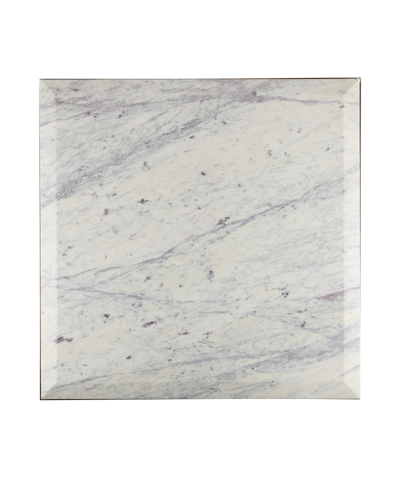 The Oblique Marble Cocktail Table is a refined statement piece that combines masterful metalwork with luxurious stone. Its tapered legs and intersecting frame in an antique brass finish holds the chamfered top, which is made of exquisite white lilac marble and sits slightly elevated above the frame. This creates a striking floating effect. The marble’s subtle veining will vary from piece to piece.