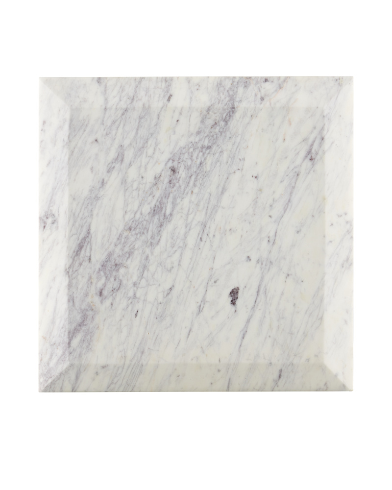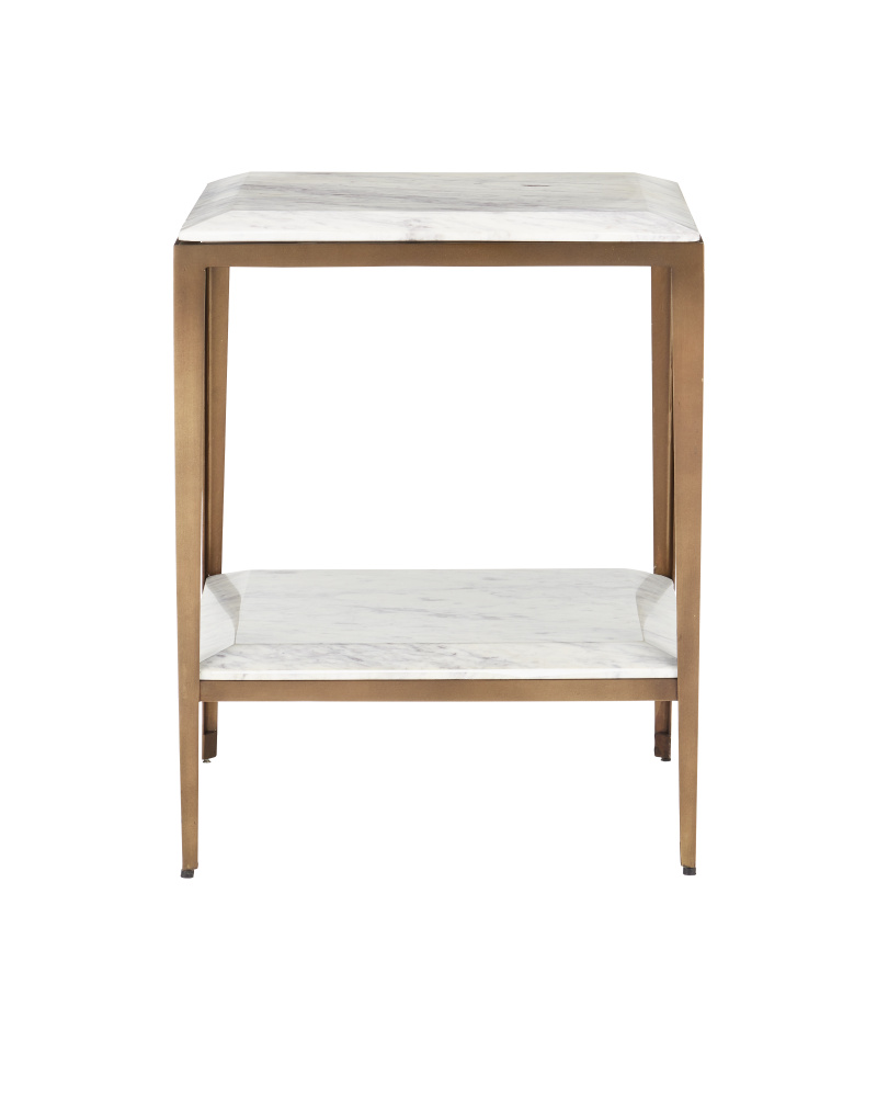 The Oblique Marble Side Table is a refined statement piece that combines masterful metalwork with luxurious stone. Its tapered legs and intersecting frames in an antique brass finish hold the chamfered top and lower shelf, each of which is made of exquisite white lilac marble and sit slightly elevated above the frame. This creates a striking floating effect. The marble’s subtle veining adds a touch of natural elegance and will vary from piece to piece.