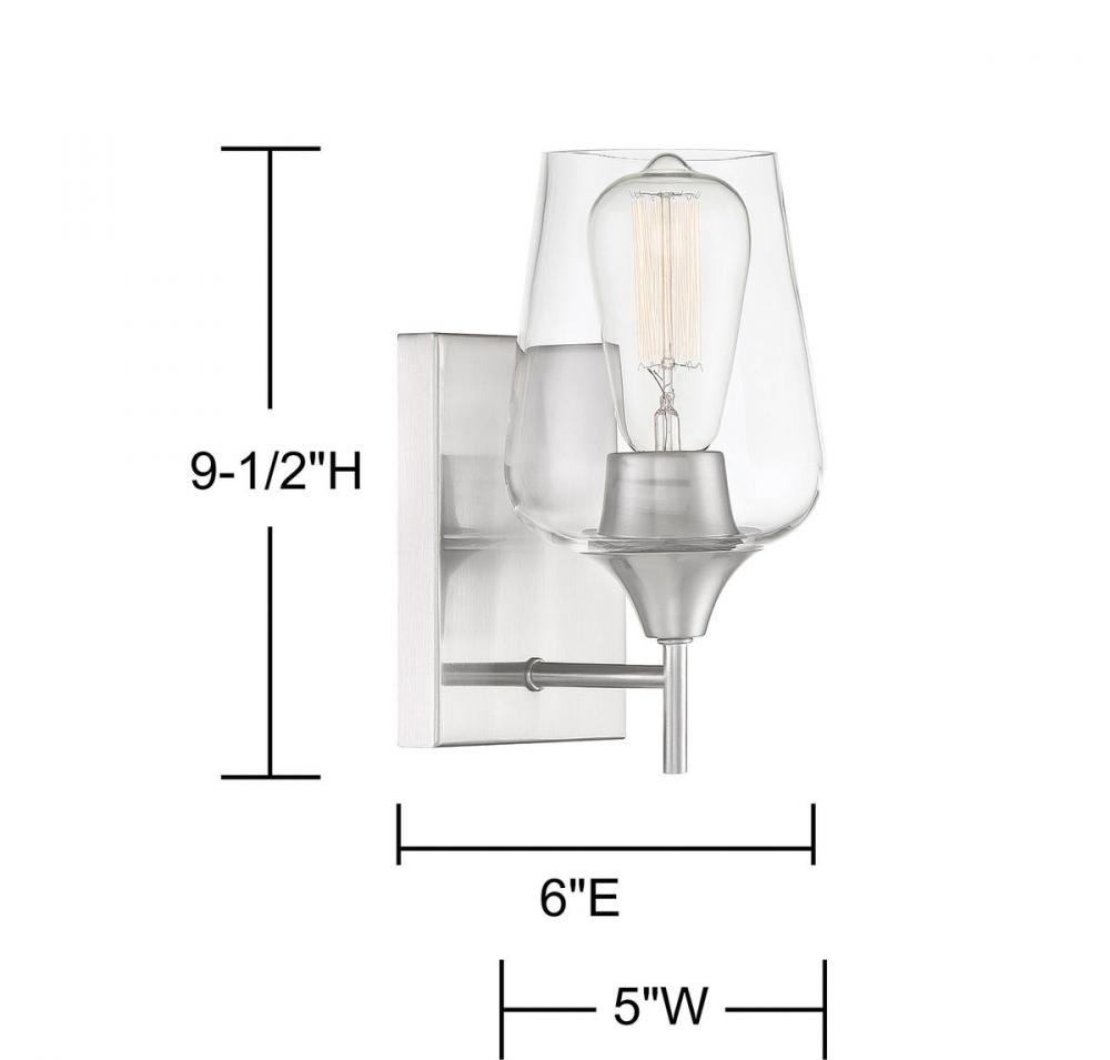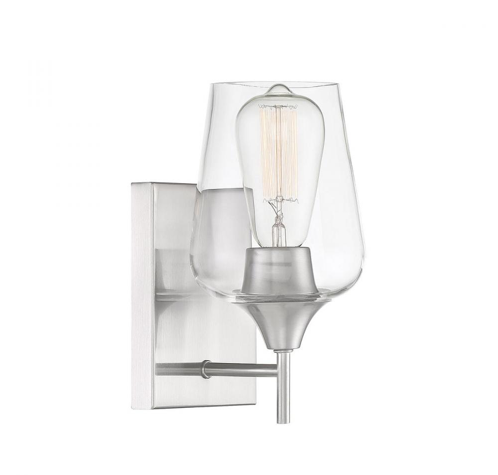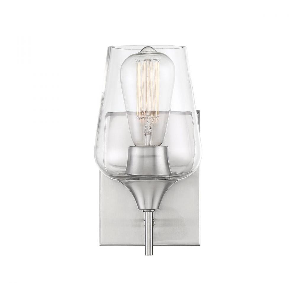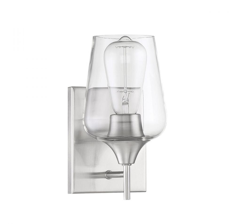 In the Savoy House Octave 1-light wall sconce, bold light-colored lines and a streamlined silhouette create an air of elegance and sophistication. The satin nickel finish and clear glass shade go with absolutely everything. Whether you have transitional, contemporary, bohemian or other decor styles in your home, you’ll love the way this Octave fixture stylishly blends in. The sconce is 5" wide, 9.5" high and extends 6" from the wall. The curved glass shade has a graceful, uncluttered look and one 60W standard size bulb provides lovely light. You’ll want to cluster several of these together for clean, casual style in your dining area, living room, kitchen, entryway, bedroom, bathroom, office, family room or hallway.